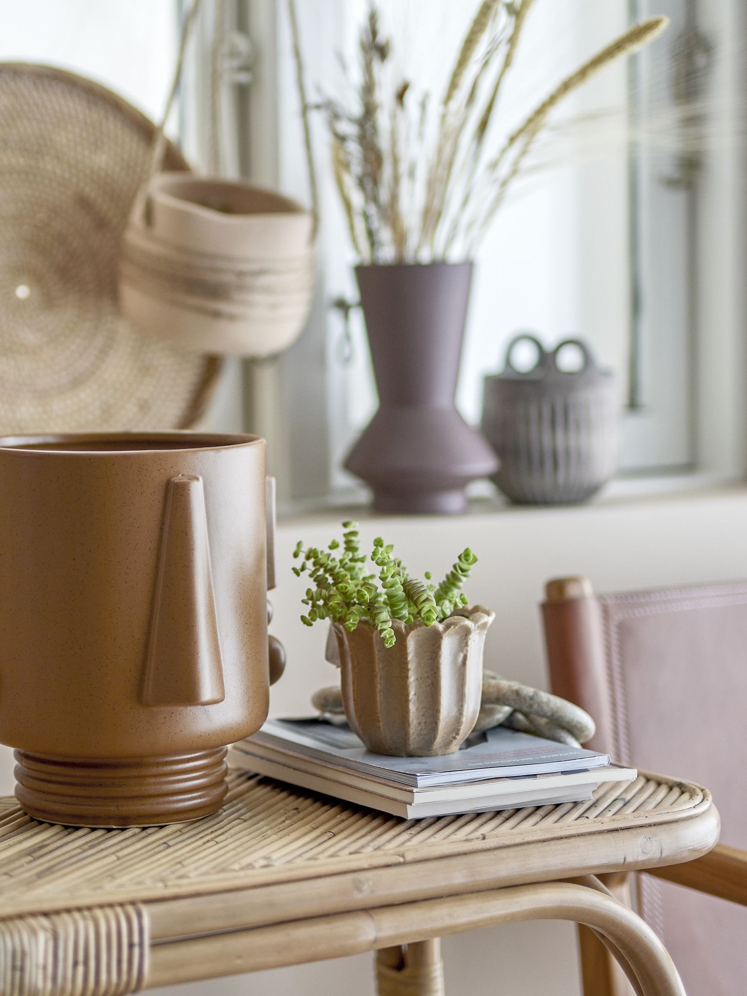 Guxim blomkruka från Bloomingville i brun stengods, H 22,5 cm, 20,5 x 20,5 cm. Passar i ditt vardagsrum eller kök; funkar fint för krukväxter, är snygg, praktisk, håller länge och en bra detalj.