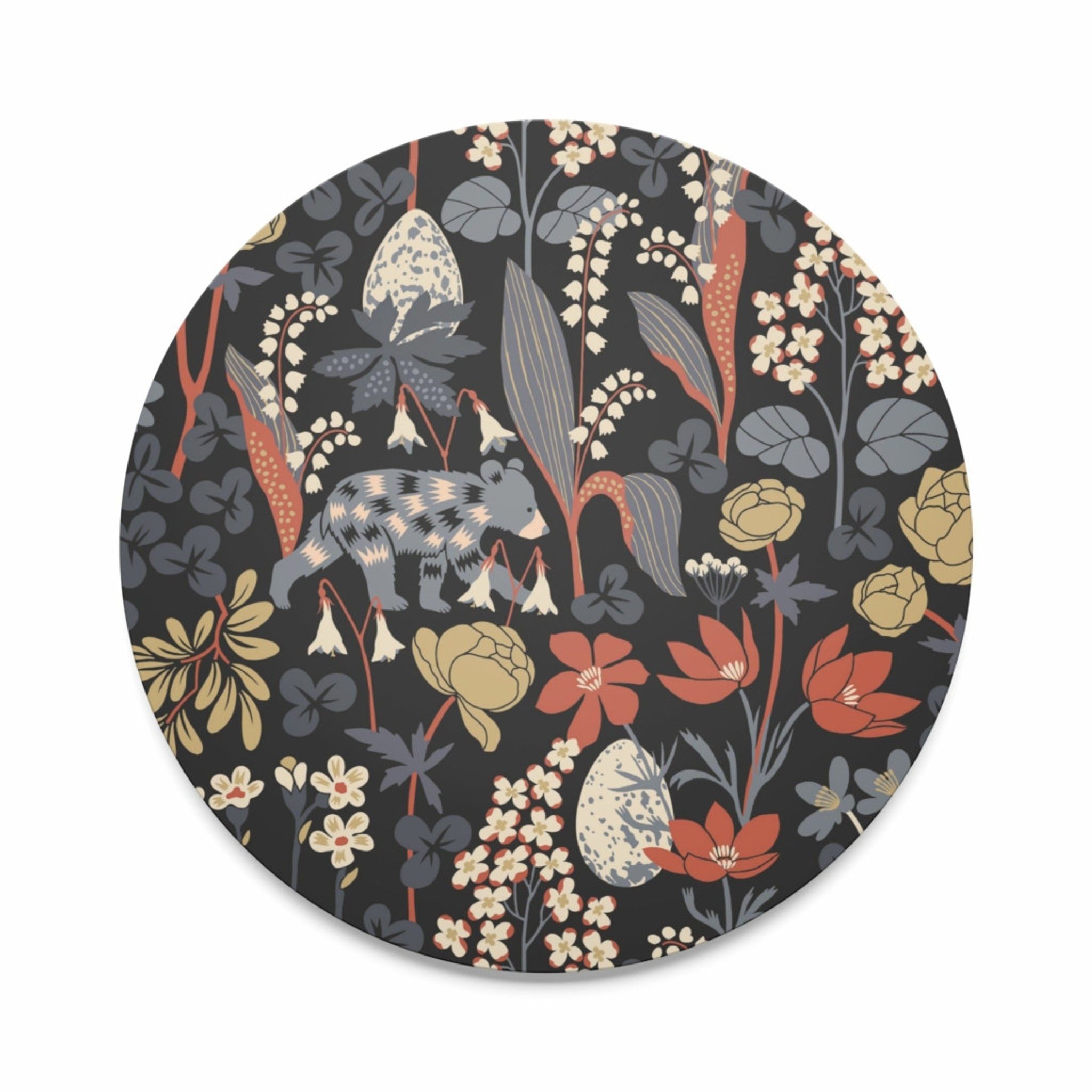 Här Sover Ingen Björn mörkblå runt grytunderlägg från Arvidssons Textil, designat av Hanna Werning. Det rundade MDF-grytunderlägget har ett färgstarkt flora-motiv i mörkblå nyanser och skyddar bordsskivan mot hetta vid matlagning och servering.