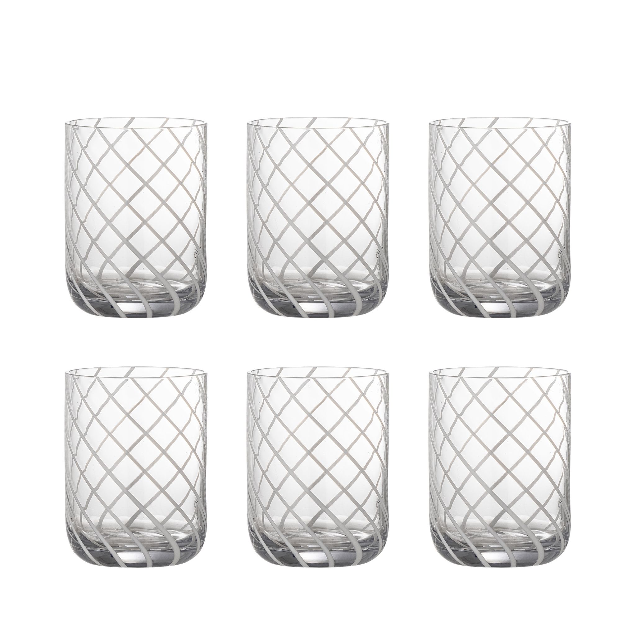 Havin Dricksglas, 6-pack genomskinliga glas Ø7 cm – Bloomingville. Stilrent glas med diagonalt nätmönster som lyfter dukningen.