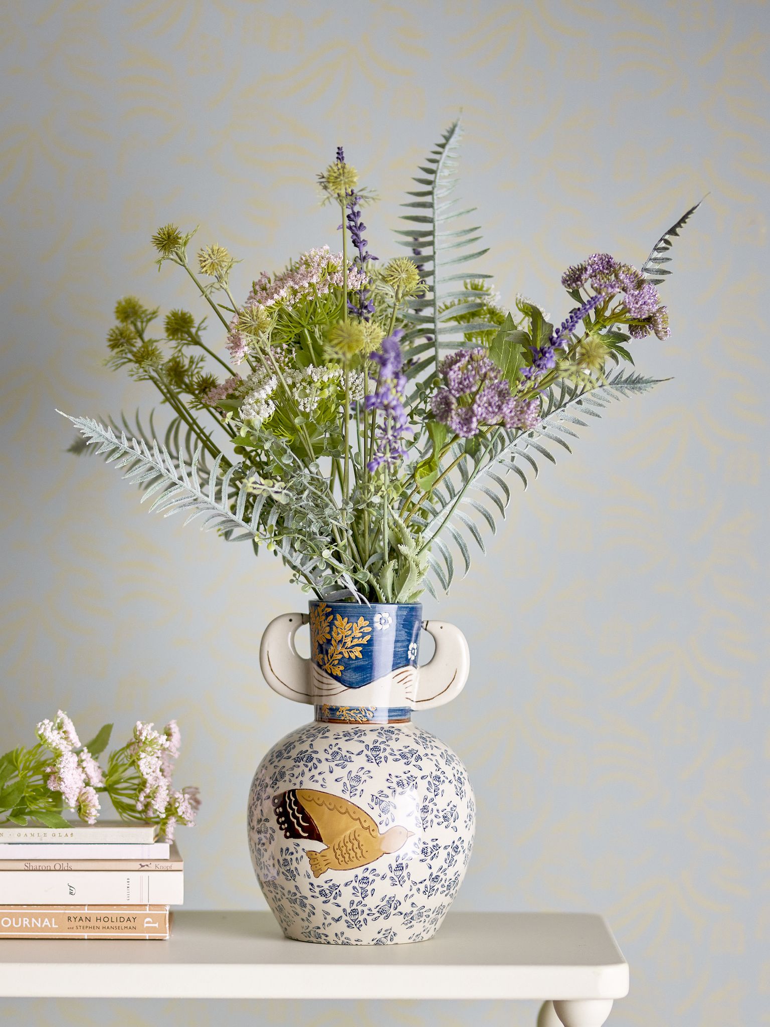 Hezha-vasen från Bloomingville är en handdekorerad stengodsvas i blå toner som passar som en dekorativ detalj i ditt hem. Du kan ställa den på sidobordet, använda den som mittpunkt på bordet eller placera den i vardagsrummet för att skapa en varm stämning och visa upp dina blommor.