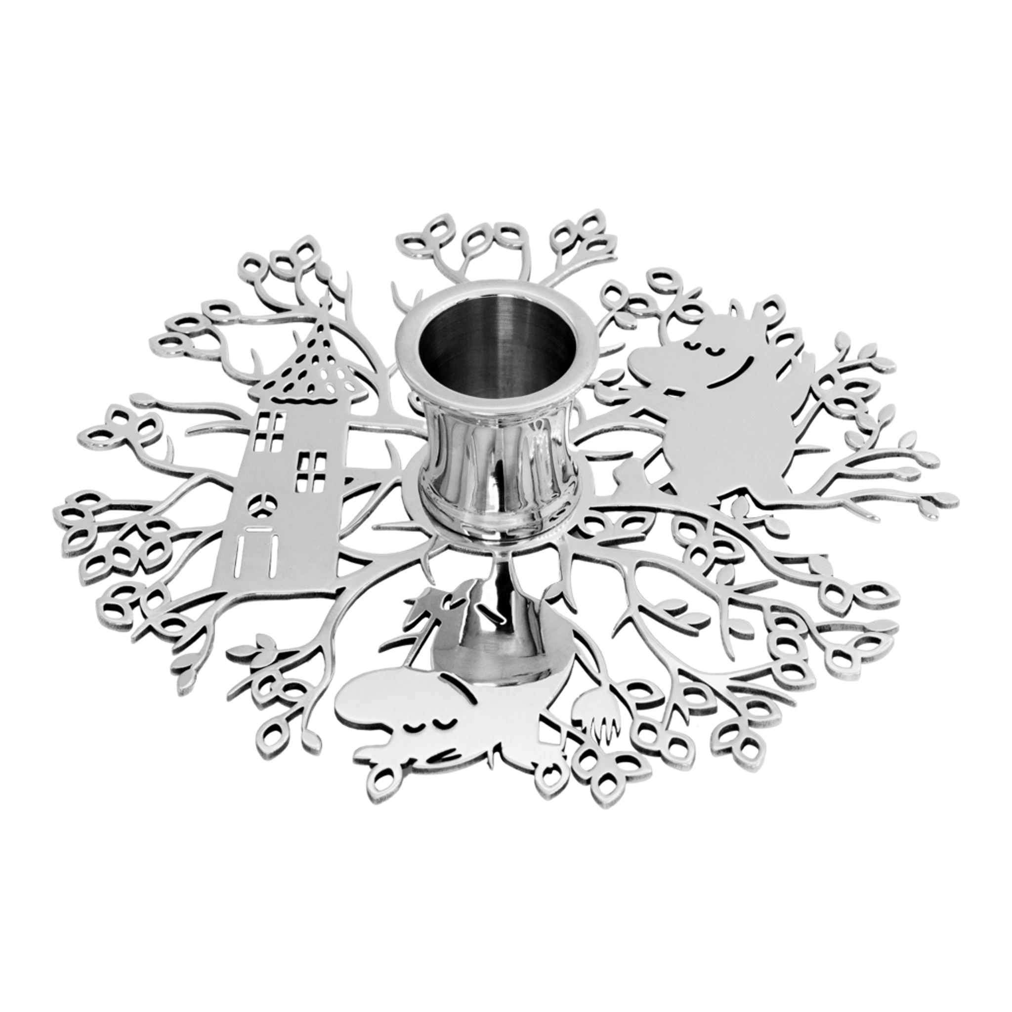 Exklusiv Hilke x Mumin ljusstake i förnicklad mässing. Designad av Giovanna Hilke, inspirerad av Tove Janssons Muminvärld. Storlek: Ø13,2×H3,3 cm.