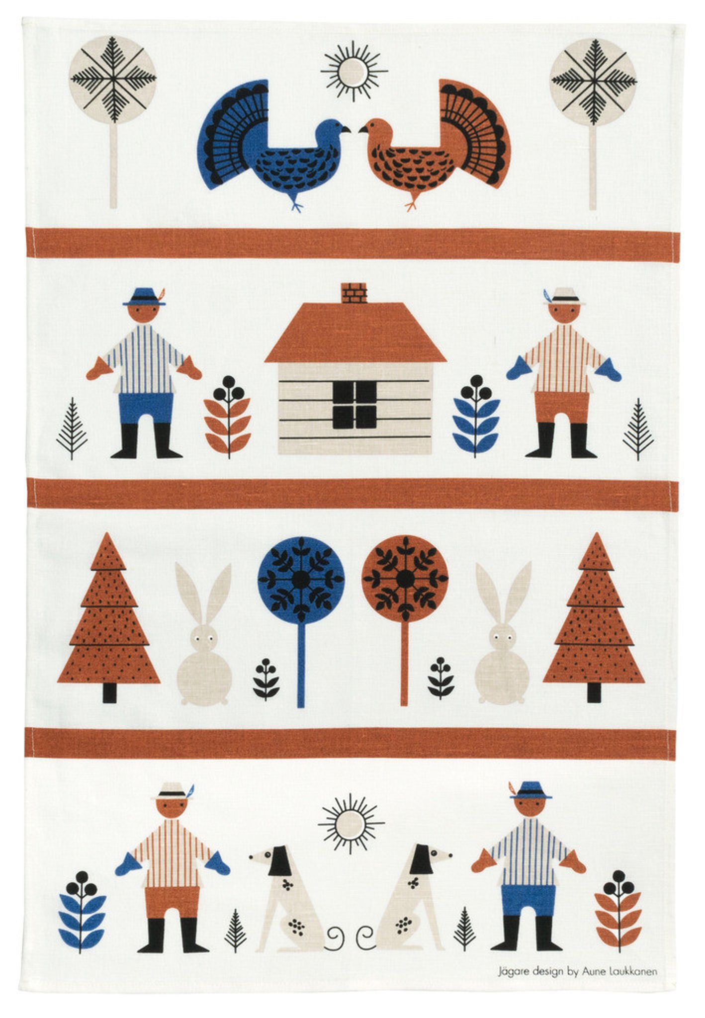 Upptäck kökshandduken Jägare i stilren blå och brun, designad av Aune Laukkanen. En funktionell och vacker inredningsdetalj för ditt kök.