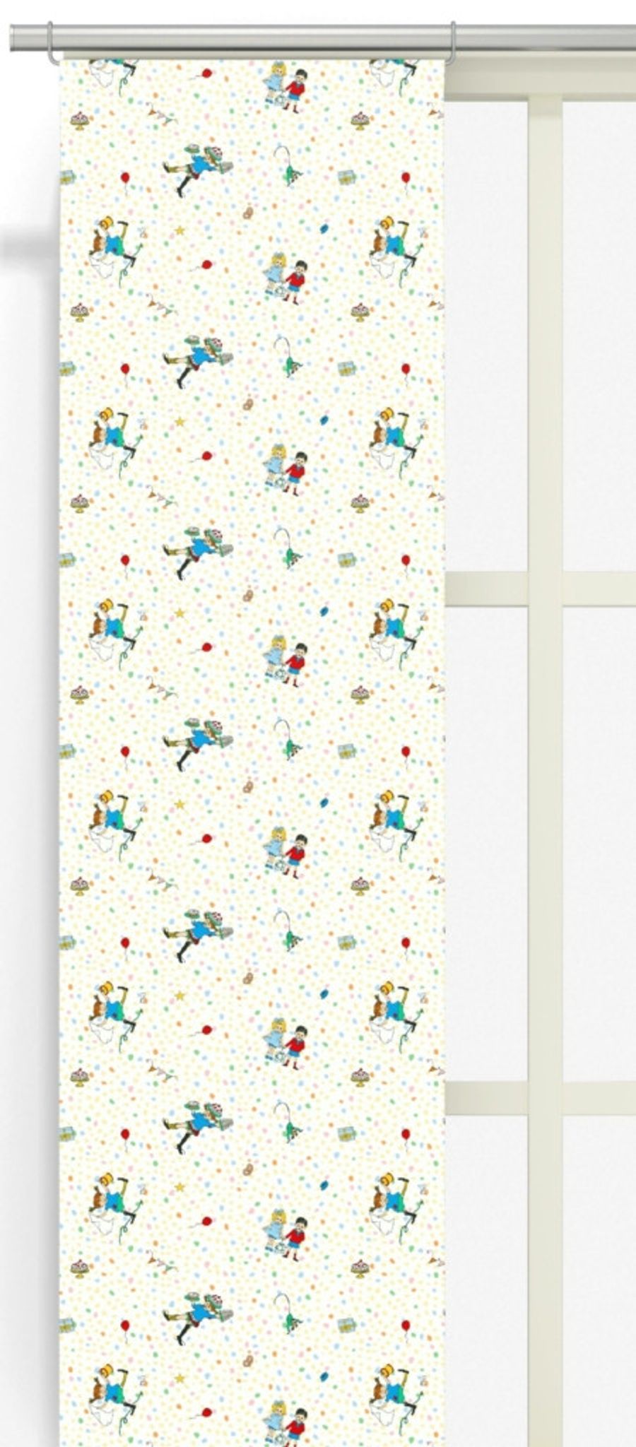 Kalas Hos Pippi multi panellängd 2-pack från Arvidssons Textil skapar lekfullt fönsterljus i barnrummet. Tillverkad i 100% bomull med ett färgstarkt mönster inspirerat av Astrid Lindgrens Pippi Långstrump. Levereras som ett praktiskt 2-pack paneler som passar de flesta standardfönster.