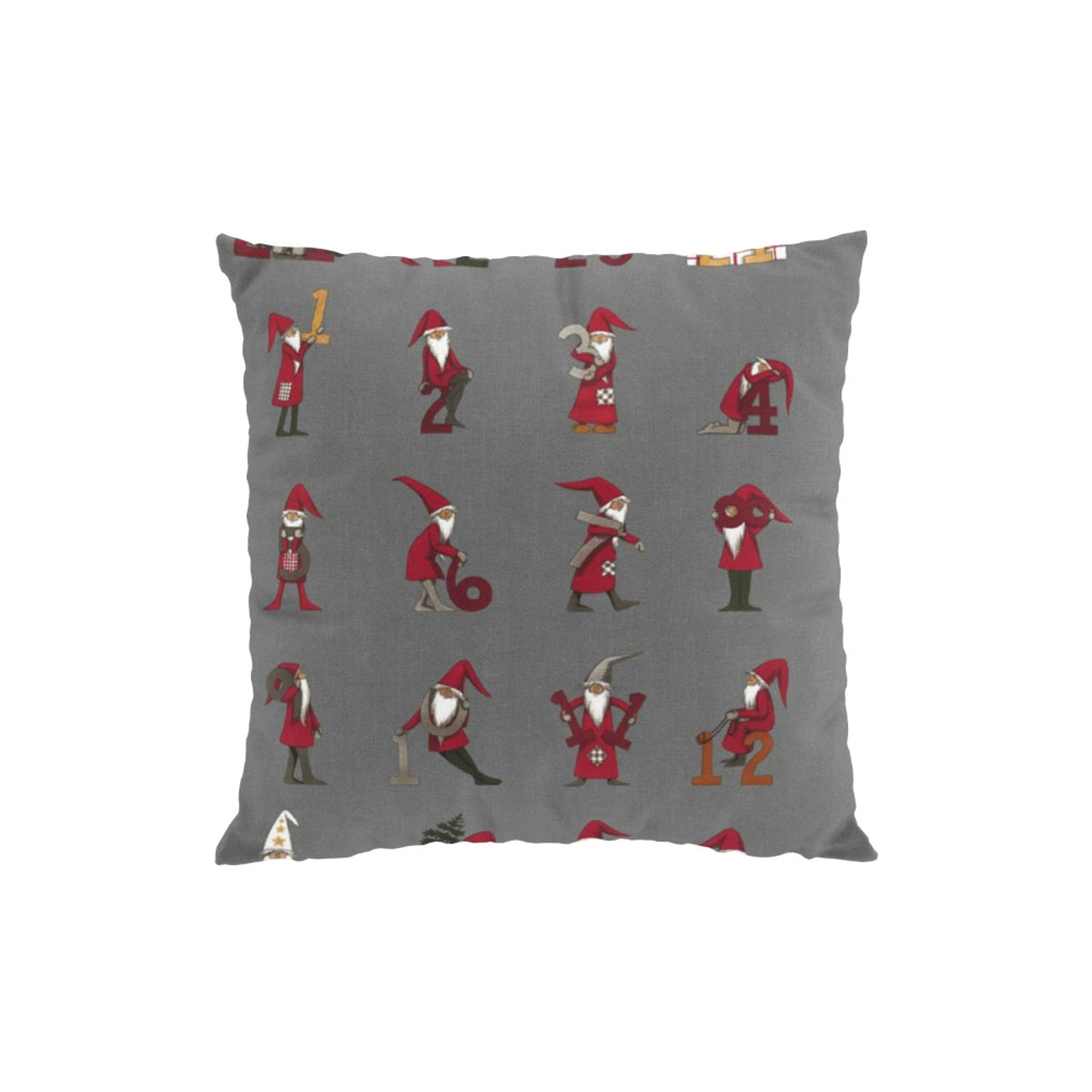 Kalendertomtar grå kuddfodral från Arvidssons Textil – en charmig och lekfull inredningsdetalj för soffan, sängen eller fåtöljen.