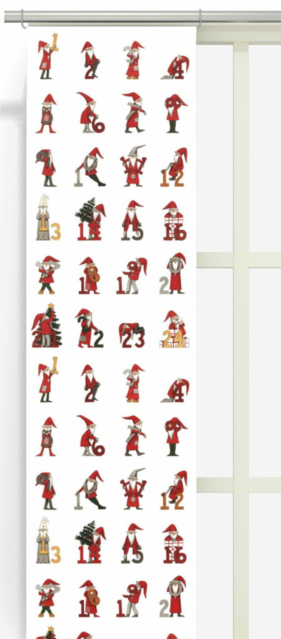 Kalendertomtar offwhite/röd panellängd 2-pack från Arvidssons Textil ger en charmig adventsstämning samtidigt som den fungerar som praktisk panelgardin. Tillverkad i mjuk bomull med karaktäristiska tomteillustrationer i rött på offwhite bas. Designad av Mialotta Arvidsson Mars.
