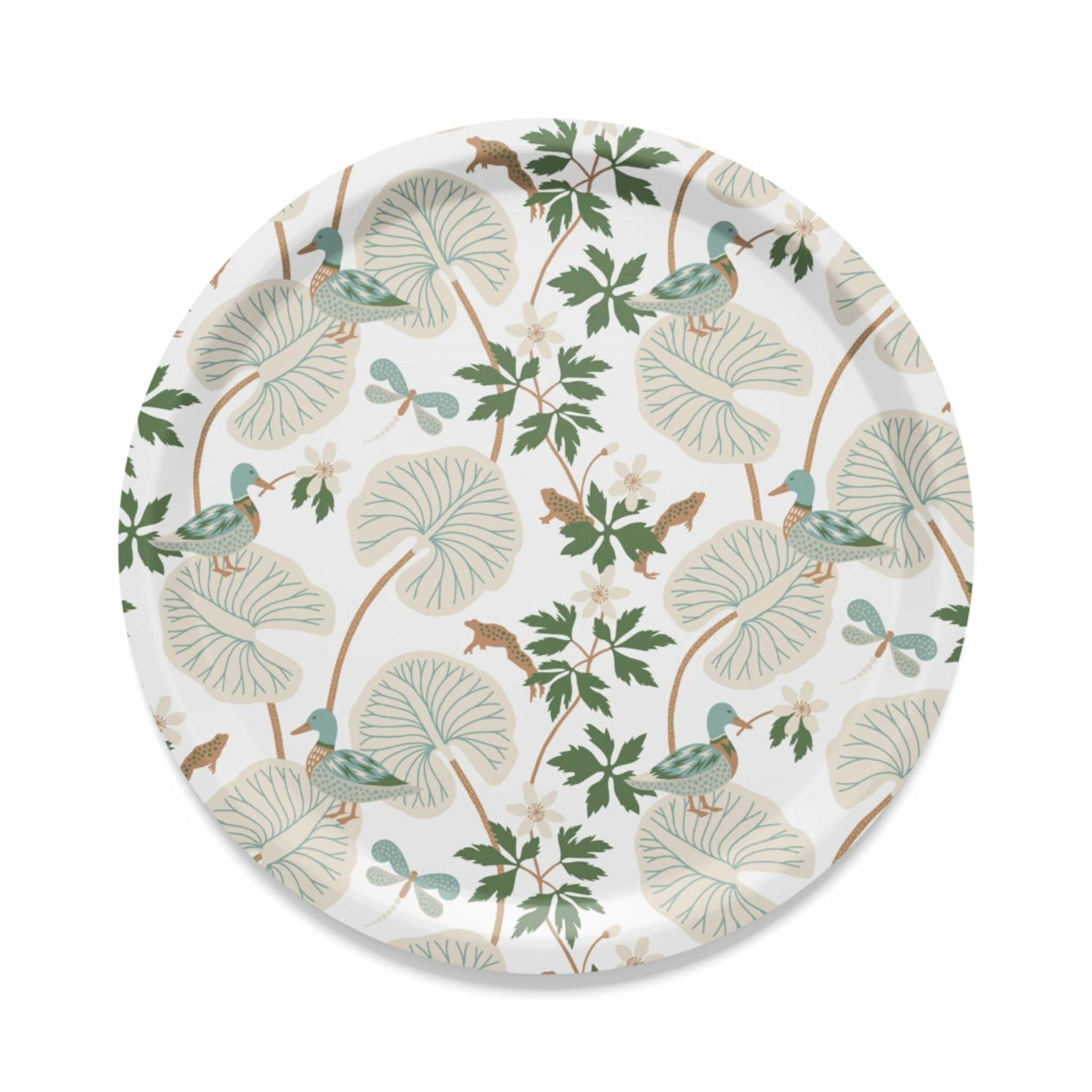 Kärrleken offwhite/grön rund bricka Ø38 cm från Arvidssons Textil, designad av Hanna Werning. Brickan i björkfanér kombinerar naturmaterial med ett mjukt avvikande mönster i offwhite och grönt – perfekt som serveringsbricka eller dekorativt inslag på bordet.