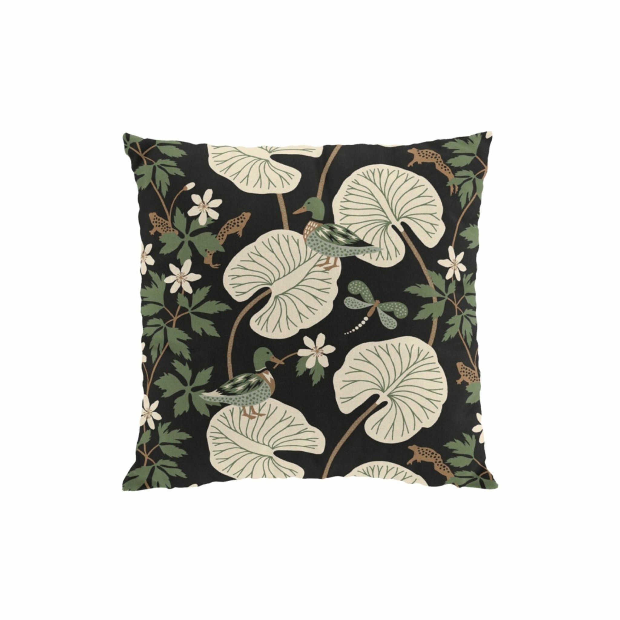Kärrleken svart/grön kuddfodral Arvidssons Textil – ett färgstarkt tillskott för vardagsrummet eller sängen. Tillverkat i bomull med ett naturinspirerat motiv i gröna nyanser på en svart bakgrund, designat av Hanna Werning.