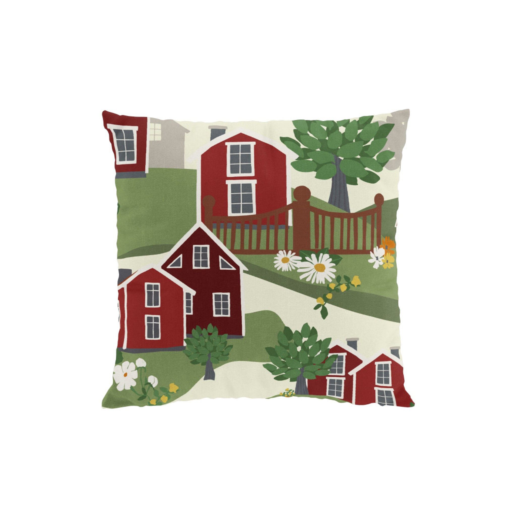 Tillverkad i 100% bomull som känns mjuk mot huden, är slitstark och enkel att vårda. Det karaktäristiska Katthult-mönstret med röda hus och gröna fält ger rummet en varm, välkomnande känsla.
