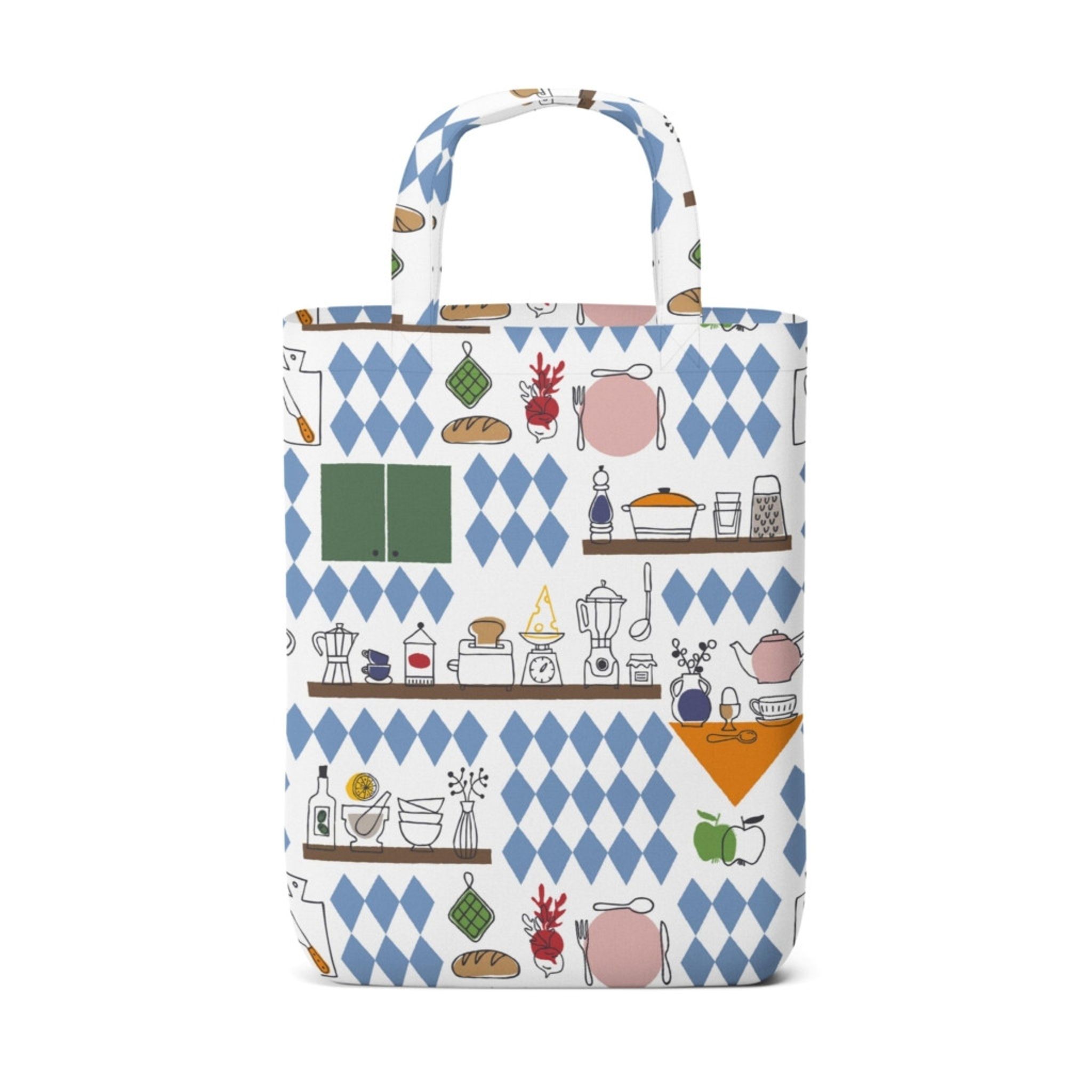 Köket blå/grön kasse Arvidssons Textil är en hållbar återanvändbar kasse i bomull, perfekt för kökets småvaror, lunch eller shopping. Designen från Edholm Ullenius blandar blå och gröna nyanser med ett lekfullt kökstema.