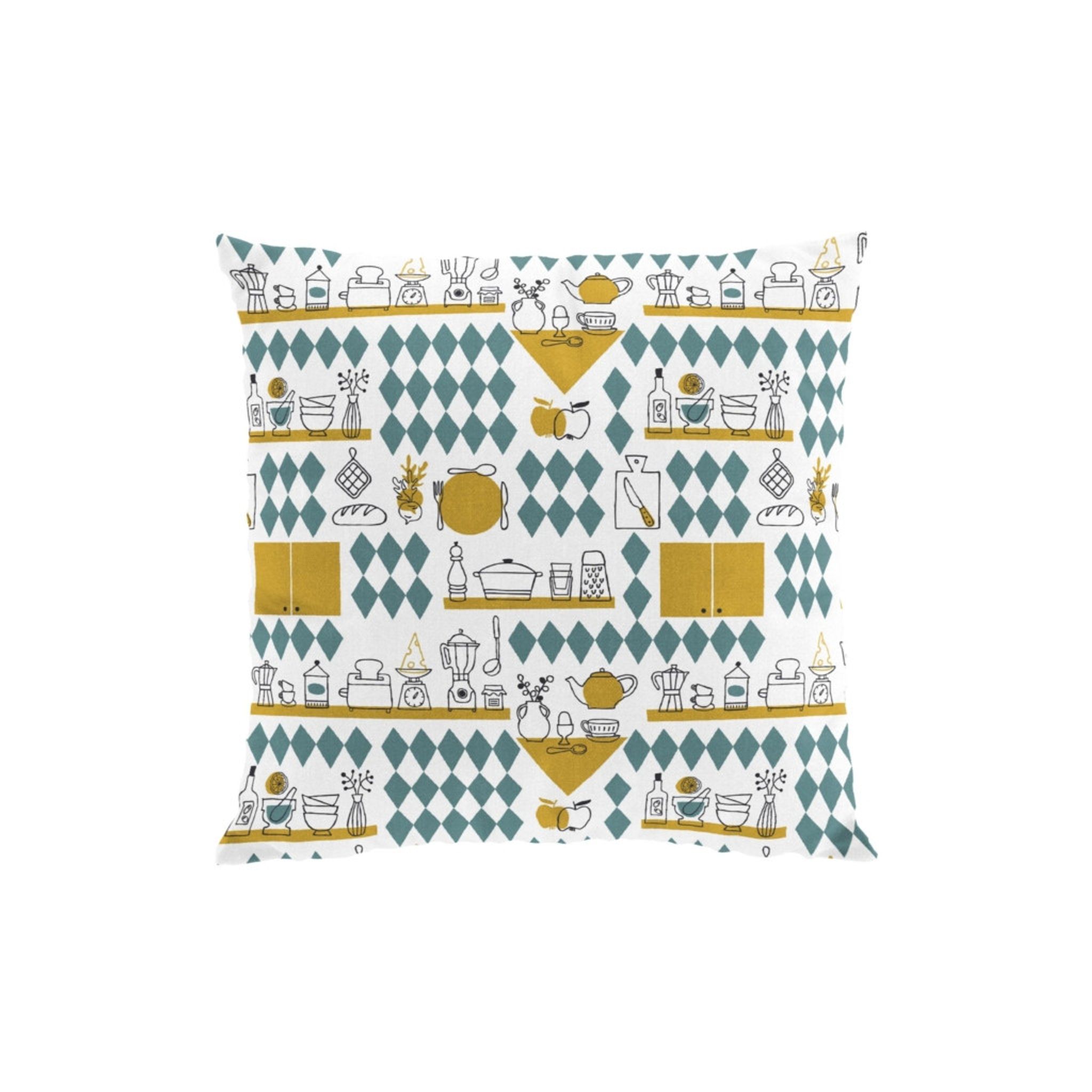 Köket grön/gul kuddfodral från Arvidssons Textil är ett lekfullt tillskott som lyfter kökets och vardagsrumets inredning. Tillverkat i bomull och formgiven av Edholm Ullenius, där gröna och gula nyanser möts i ett grafiskt mönster som passar både moderna och klassiska stilar.