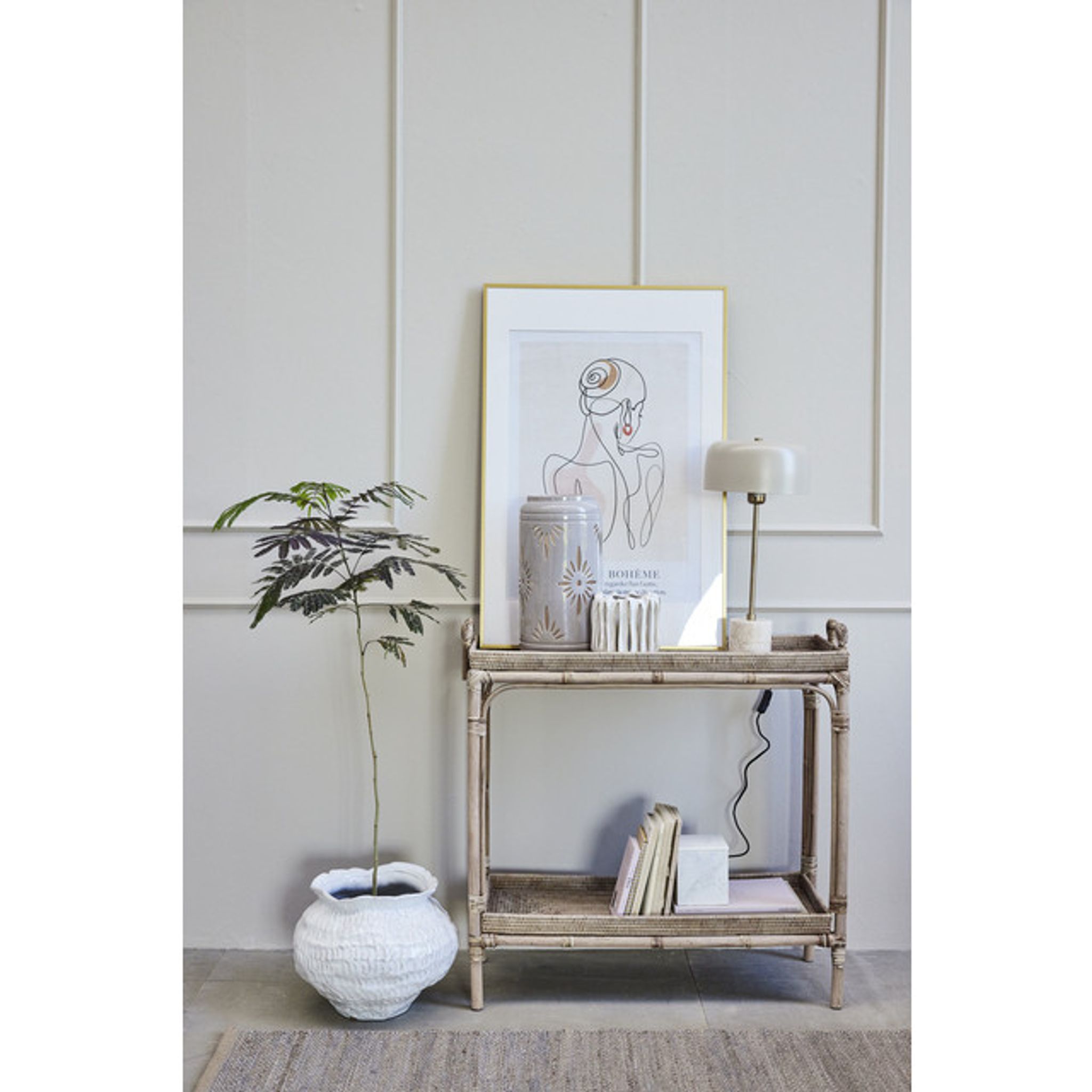 Detta handvävda konsolbord i naturlig rotting från Lene Bjerres Norah-serie är ett enkelt och praktiskt tillskott i hemmet. Som konsolbord eller sidobord passar det i hallen, vardagsrummet eller en smal korridor och ger dig en avlastningsyta för nycklar, post eller dekor som växter och lampor.