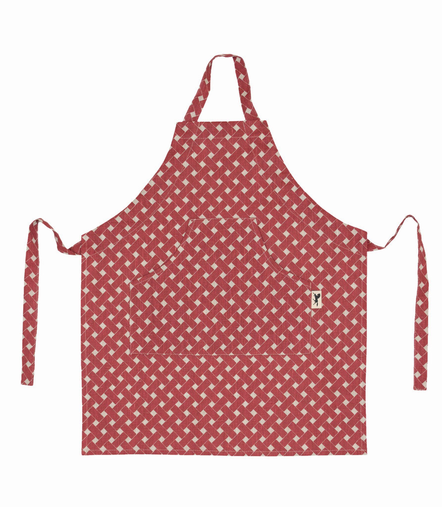 Ge ditt barn en stilfull look med detta röda barnförkläde i 100% lin, designat med det charmiga Korg-mönstret från Almedahls. Hållbart och elegant.