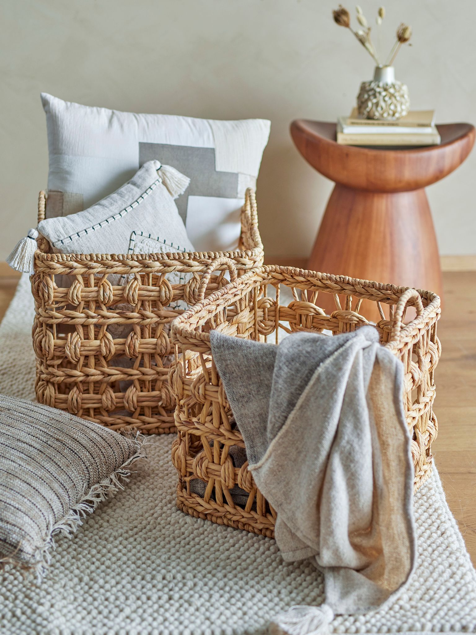 Marnie Korg från Bloomingville är ett set om två handflätade förvaringskorgar i vattenhyacint. De passar i vardagsrum, sovrum eller lekrum där du vill få bättre förvaring och lägga till en naturlig detalj i din heminredning.