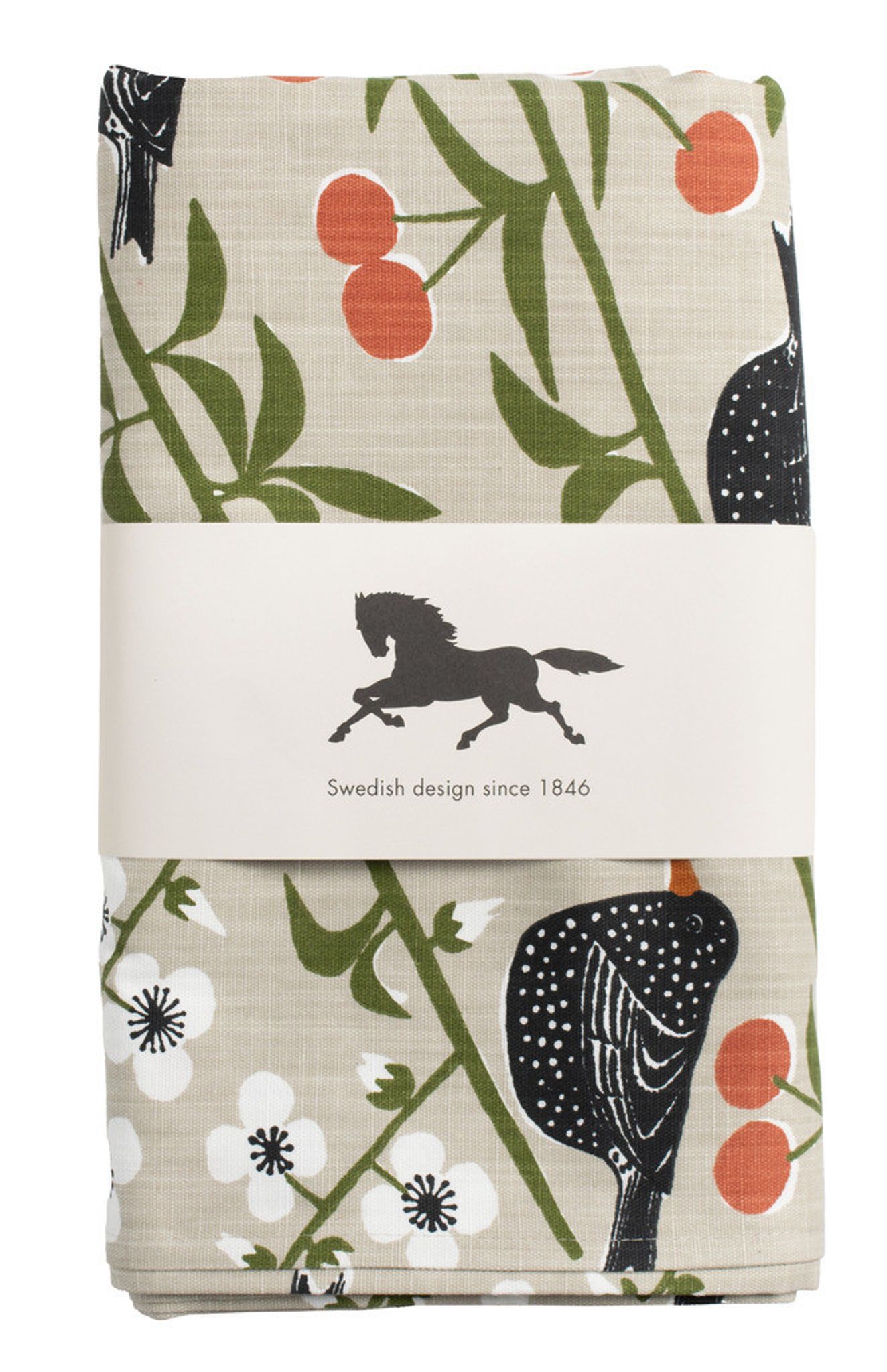 Duken är designad av den kända konstnären Marianne Westman och bär på ett handmålat motiv av körsbärsblommor, bär och starar, vilket ger en levande och organisk känsla till ditt bord.