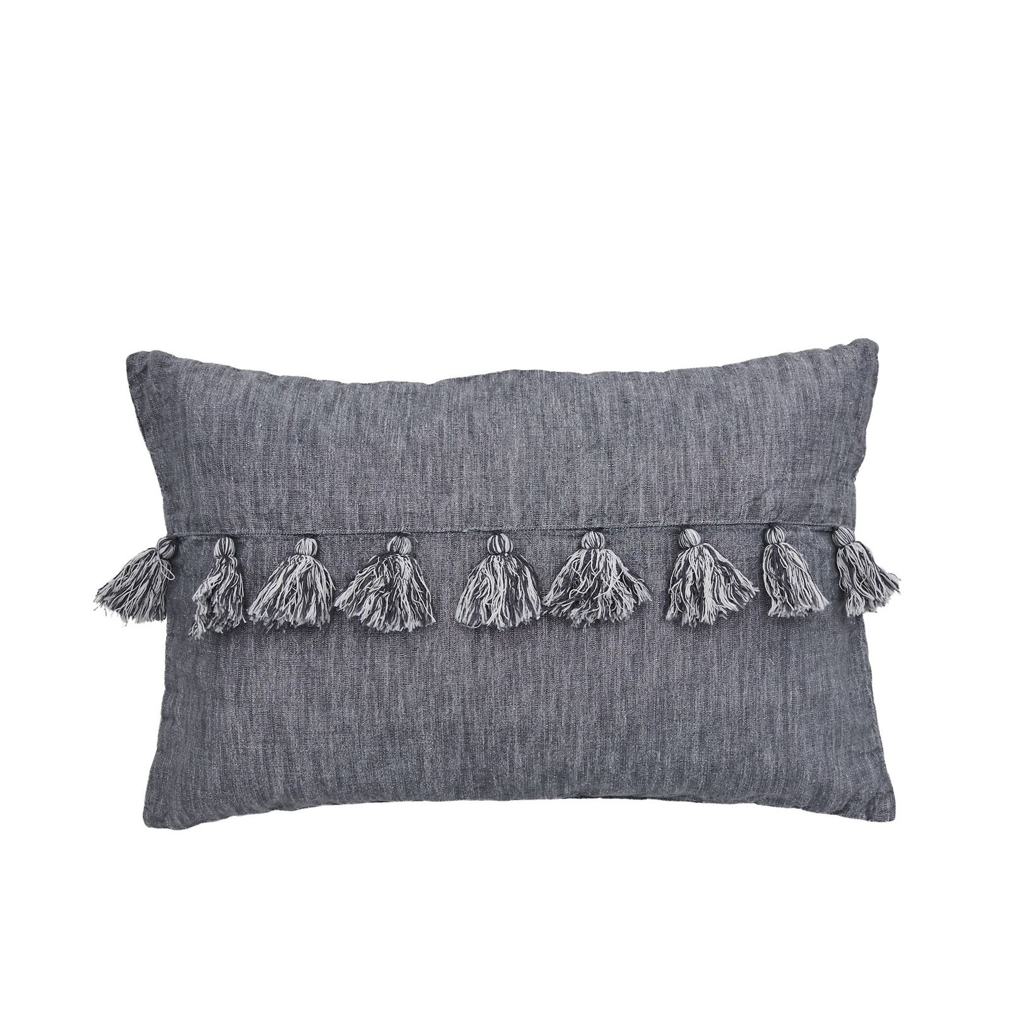 En handgjord mörkgrå linnekudde från Lene Bjerre med dekorativa tofsar. Den passar lika bra i vardagsrummet som i sovrummet och gör din soffa eller säng bekvämare när du lutar dig tillbaka eller vilar.