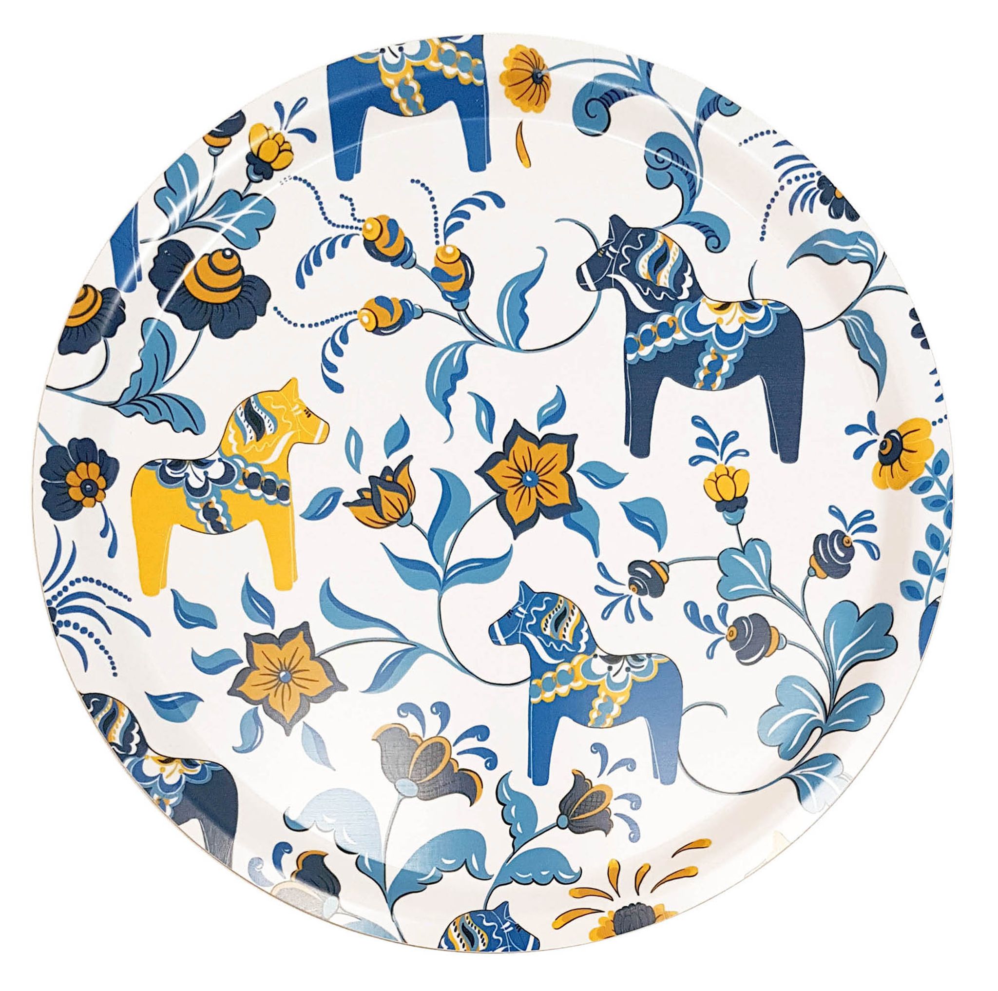 Rund bricka i Leksand blå/gul färgställning från Arvidssons Textil. Brickan bär det ikoniska Leksand-mönstret med Dalahästar och kurbitsmålningar, en färgstark hyllning till Dalarnas tradition och hantverk.