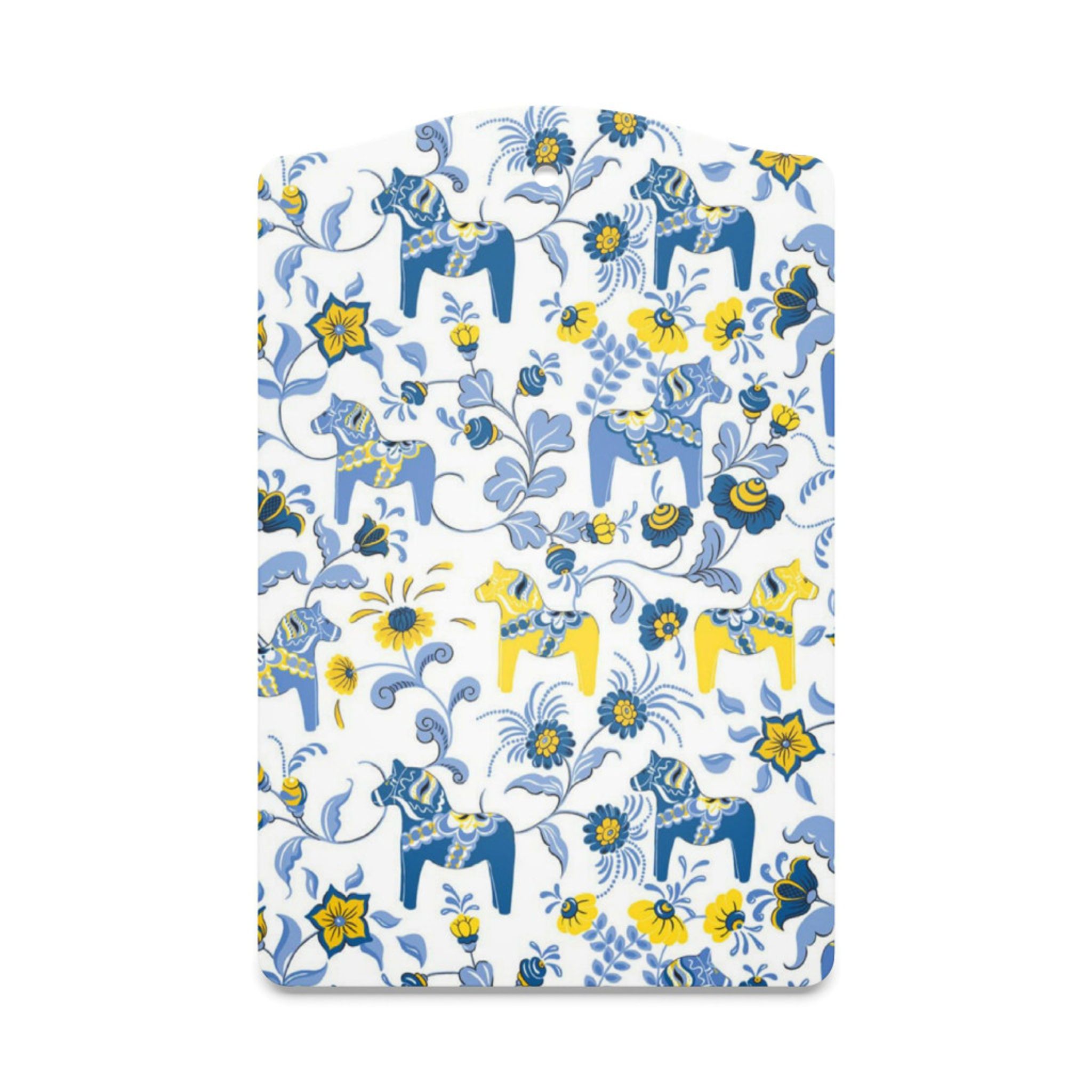 Leksand blå/gul serveringsbräda från Arvidssons Textil ger dig ett färgstarkt uttryck i köket som hyllar Dalarnas tradition och Dalahästar. Det ikoniska Leksand-mönstret blandas med kurbitsinspirerade detaljer för en livfull och lekfull bordssättning.