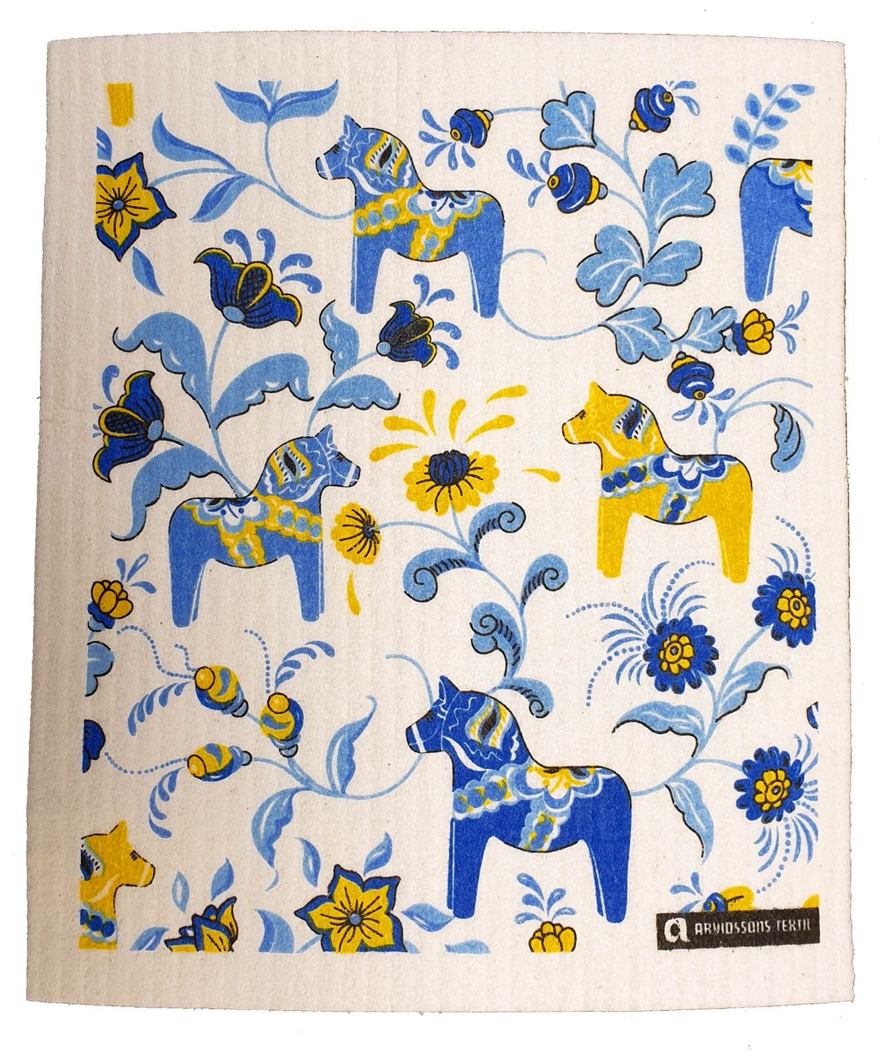 Upptäck den charmiga Leksand Mini blå/gul disktrasa från Arvidssons Textil, som för in en bit av svensk tradition i ditt hem. Med sitt lekfulla mönster av Dalahästar och blommor, skapar denna disktrasa en livlig atmosfär i köket.