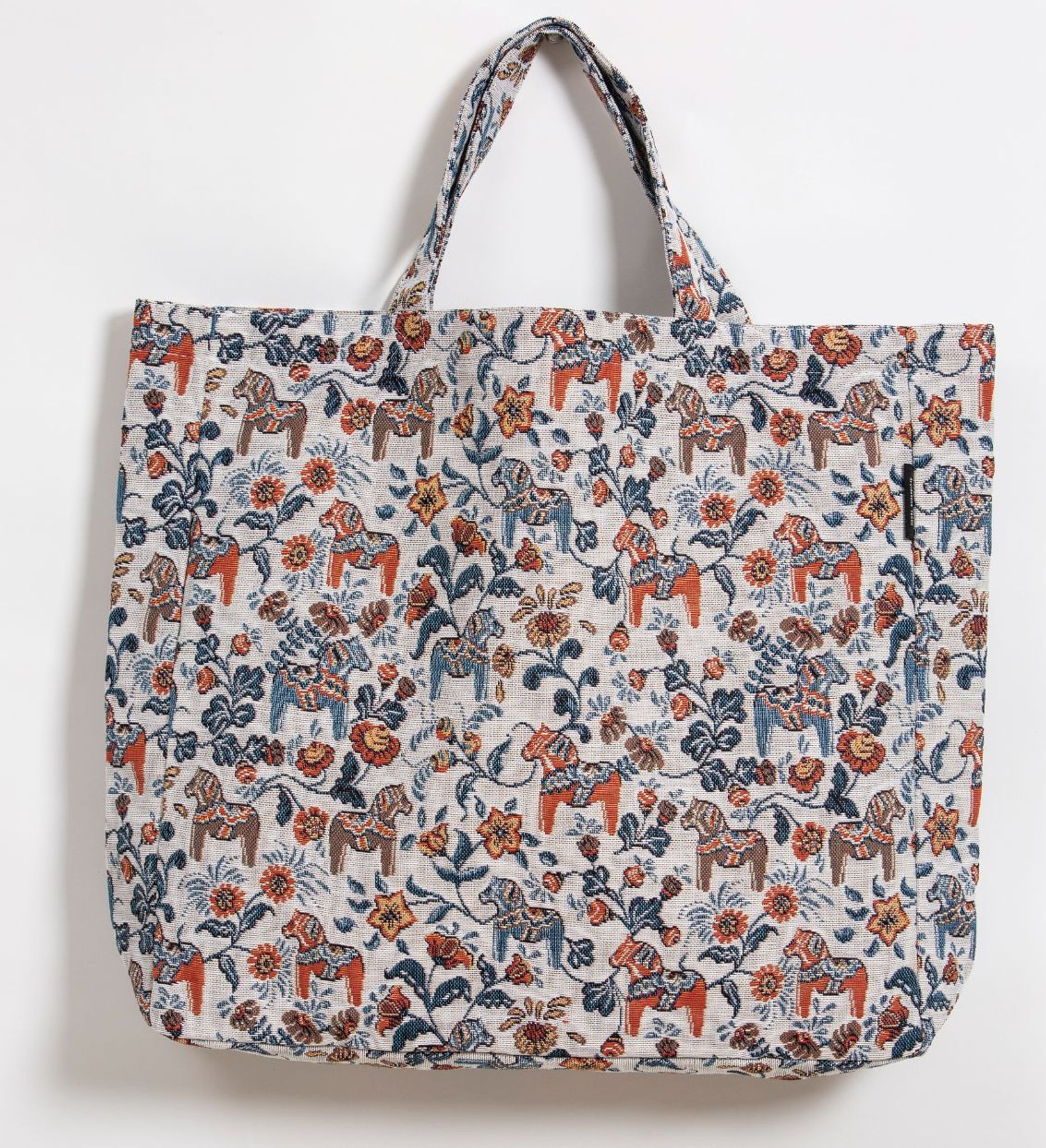Upptäck den charmiga Leksand Mini jacquard kassen från Arvidssons Textil, en perfekt kombination av funktion och traditionell svensk design. Med sitt livfulla mönster av Dalahästar och blommor, fångar denna kasse den folkloristiska andan från Dalarna.