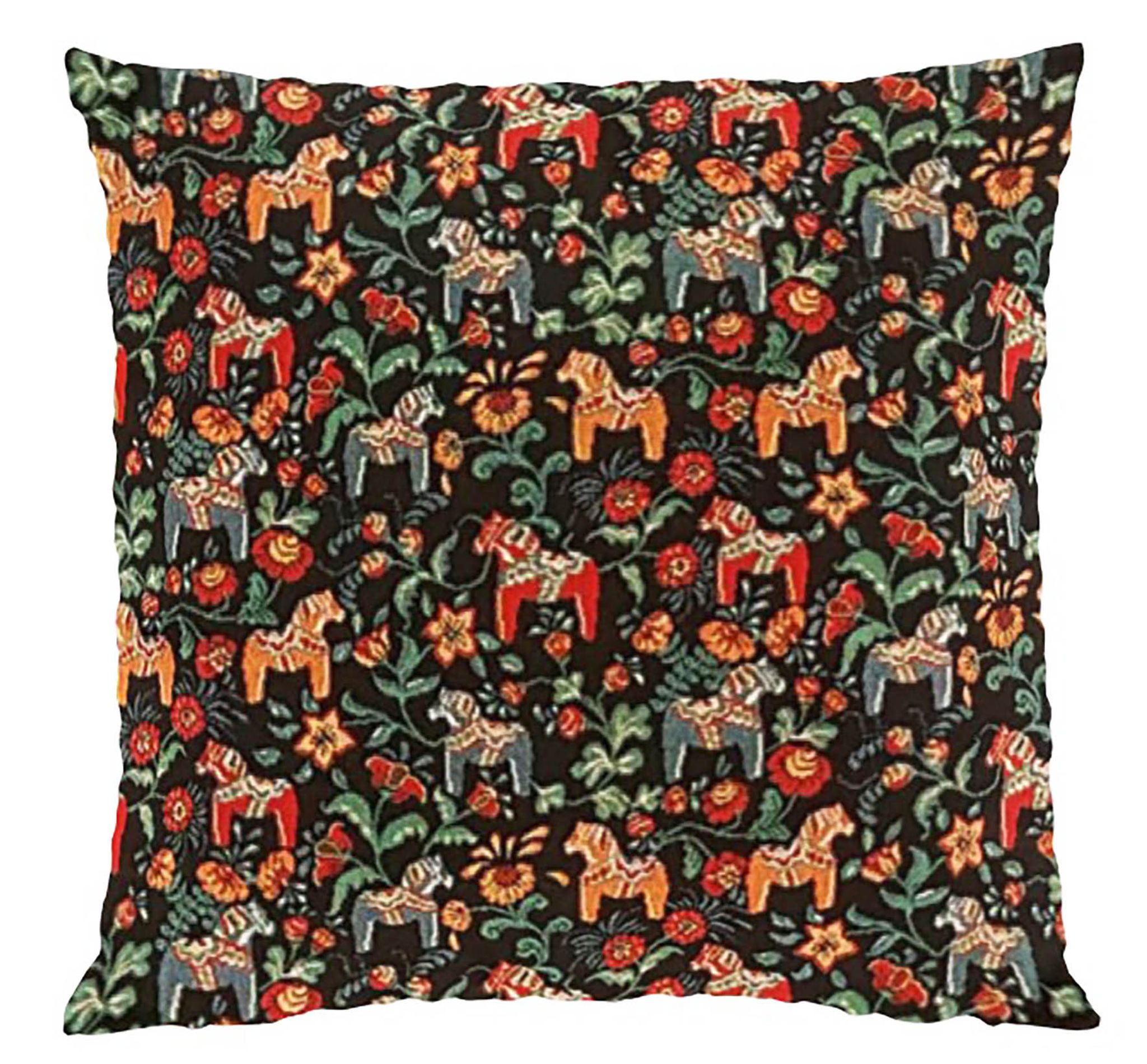 Upplev den svenska traditionen med Leksand Mini jacquard svart kuddfodral från Arvidssons Textil. Detta unika kuddfodral är designat med det charmiga mönstret "Leksand med Dalahästar", som fångar den folkloristiska andan från Dalarna.