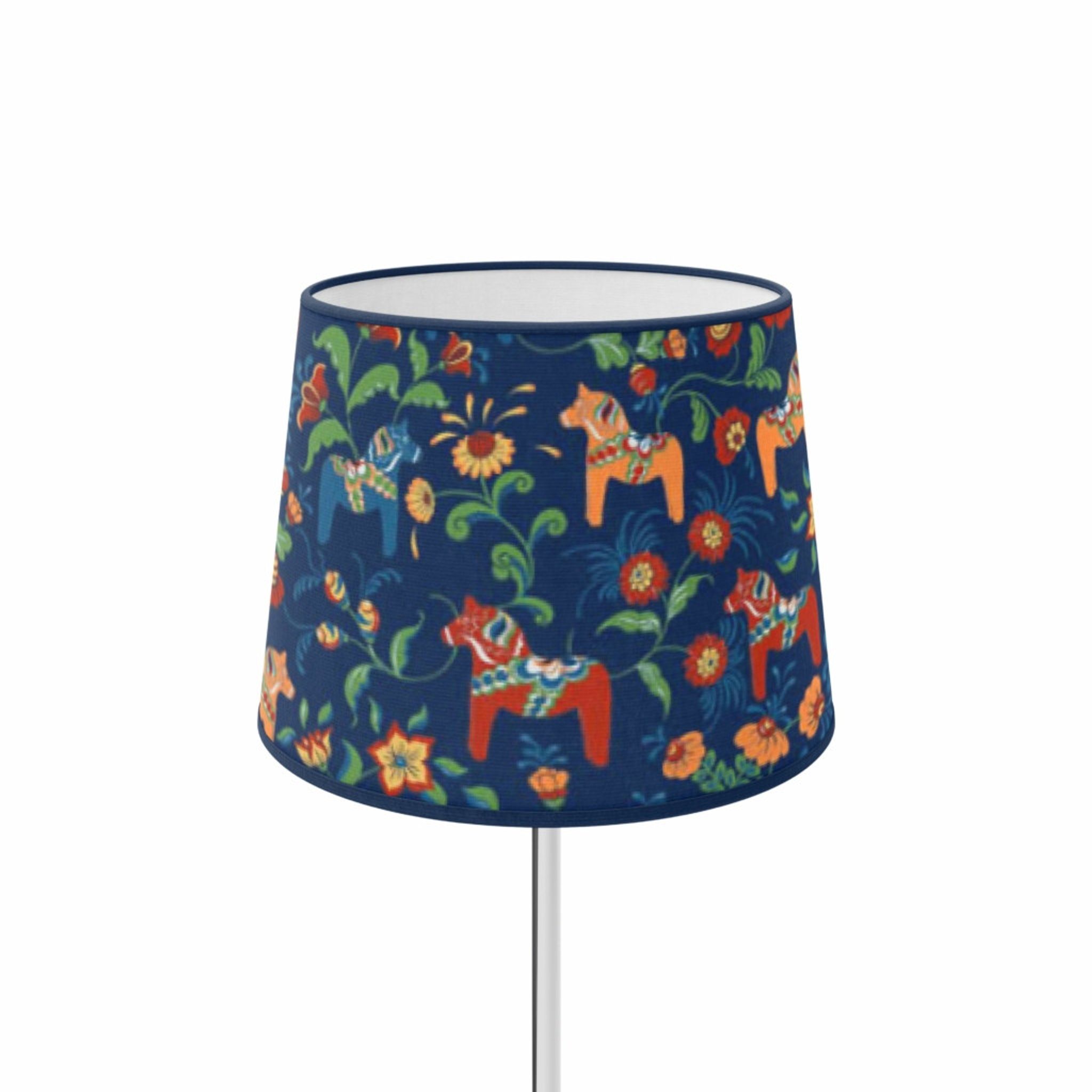 Upptäck den charmiga Leksand Mini mörkblå lampskärmen från Arvidssons Textil, med en diameter på 24 cm. Denna unika lampskärm är tillverkad av högkvalitativt tyg med det ikoniska mönstret "Leksand med Dalahästar", som fångar den folkloristiska andan från Dalarna.