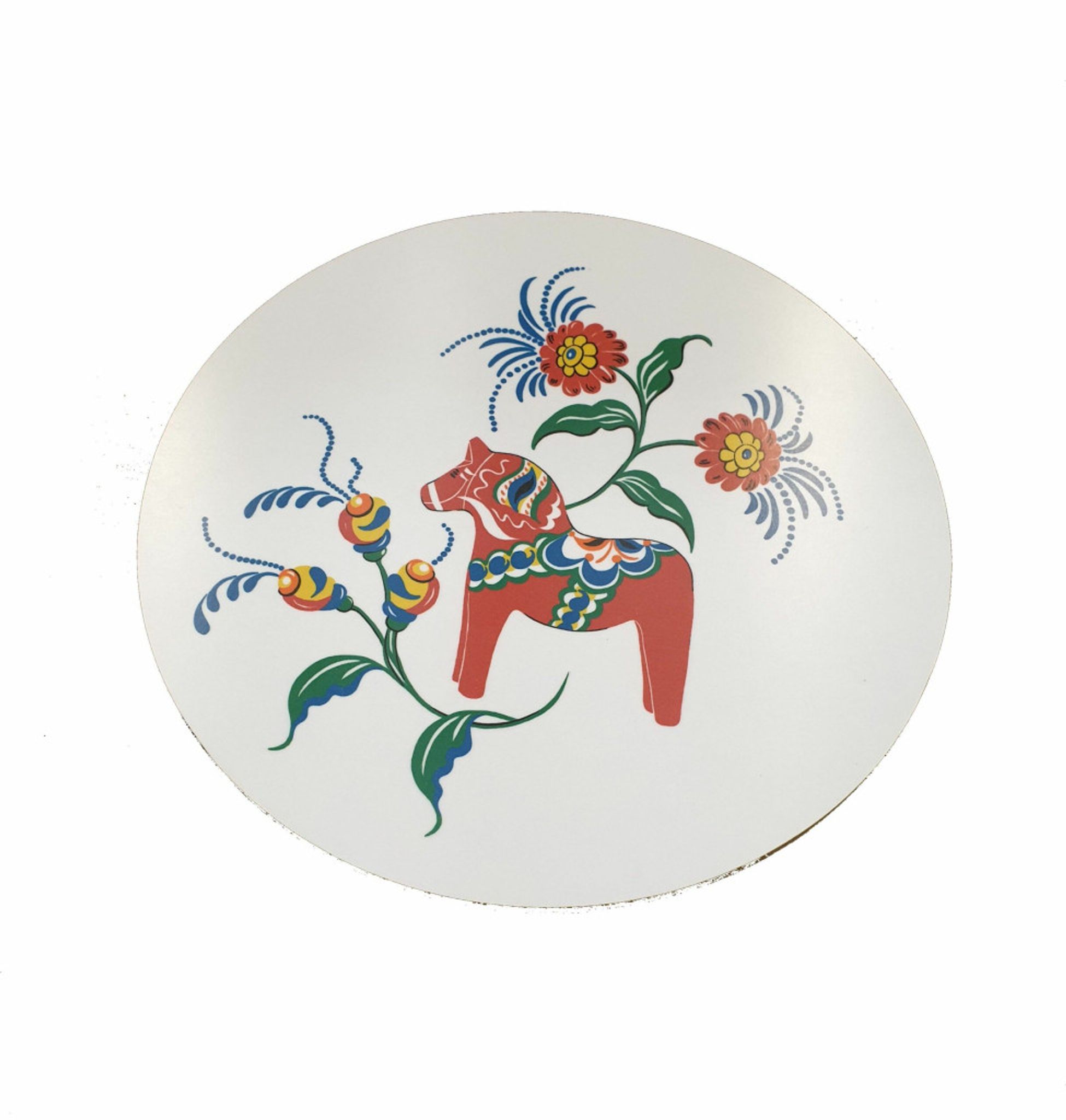 Leksand offwhite runt grytunderlägg från Arvidssons Textil — en stilren detalj som kombinerar funktion med svensk hantverkstradition. Det färgglada Leksand-mönstret med Dalahästar fångar dalarnas kultur och kurbitsmålningar och ger köket en varm, välkomnande känsla.