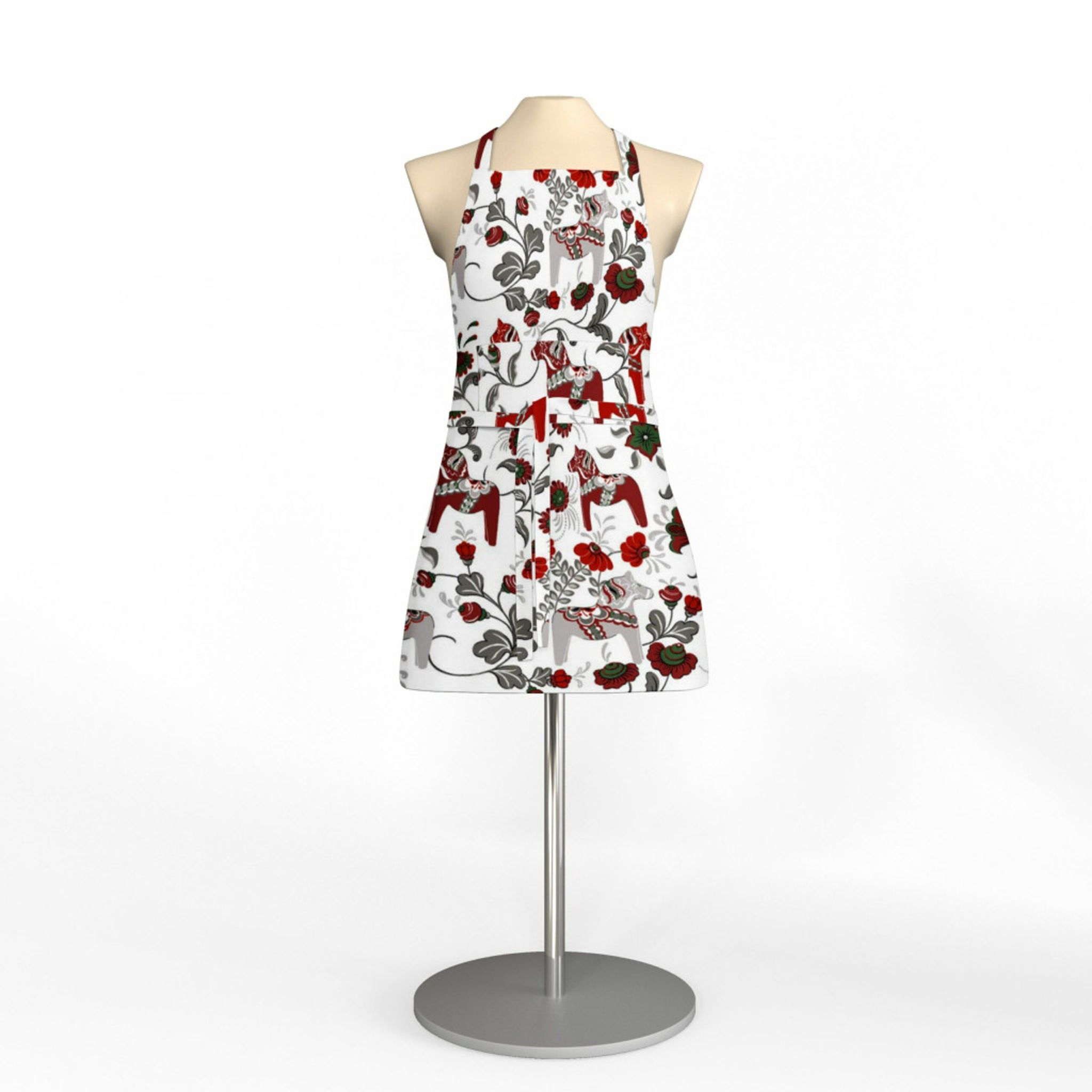 Leksand offwhite/röd förkläde med ficka från Arvidssons Textil är en stilren kökspartner som förenar funktion med svensk tradition. Tyget “Leksand med Dalahästar” bär Dalarnas ikoniska motiv – färgglatt och lekfullt i en offwhite och röd färgskala – och ger köket en rustik, pittoresk känsla.
