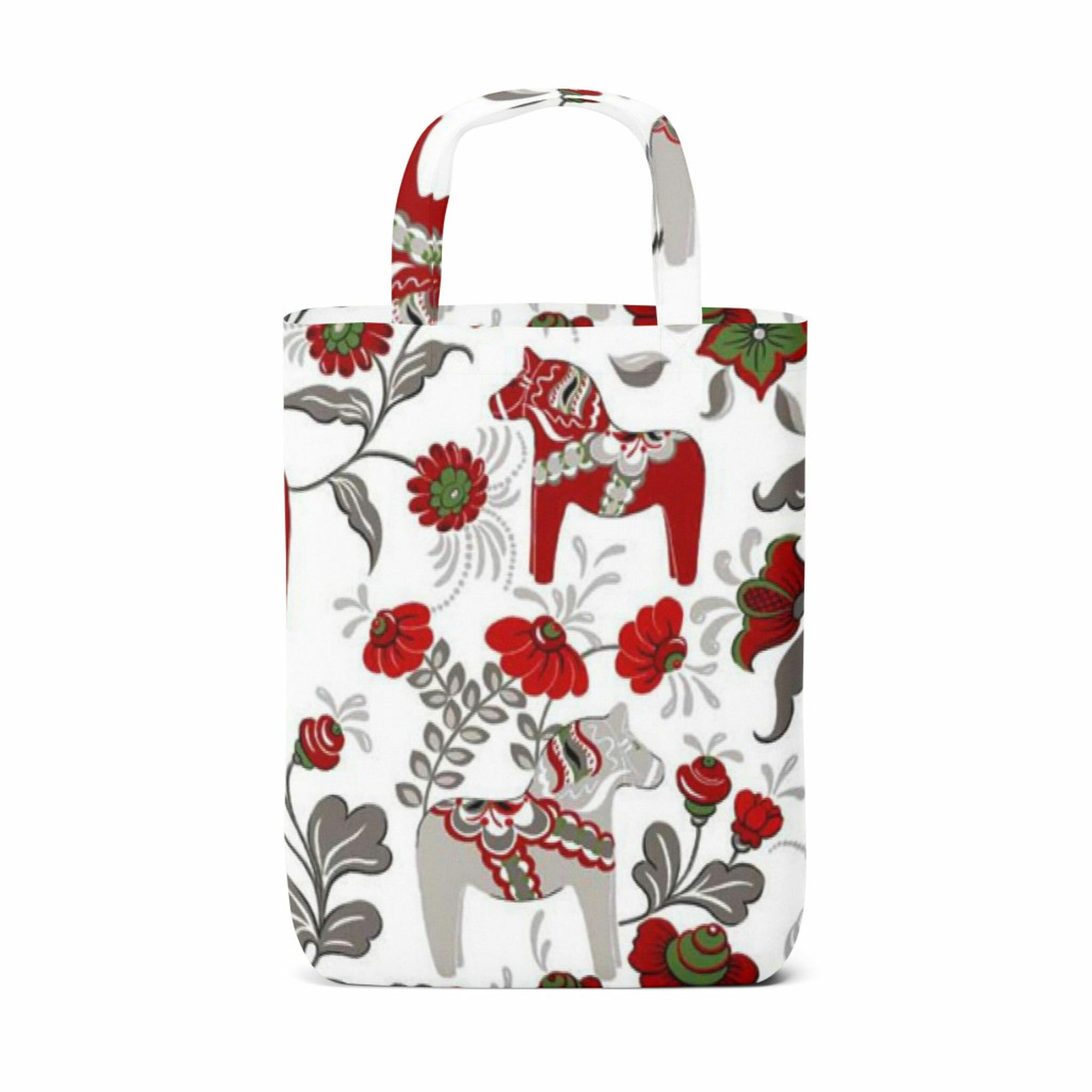 Leksand offwhite/röd kasse från Arvidssons Textil fångar Dalarna i ett färgstarkt och lekfullt motiv. Med det ikoniska Leksand-mönstret av Dalahästar är kassen lika dekorativ som praktisk och passar perfekt för vardagsbruk, shopping eller som presentförpackning.