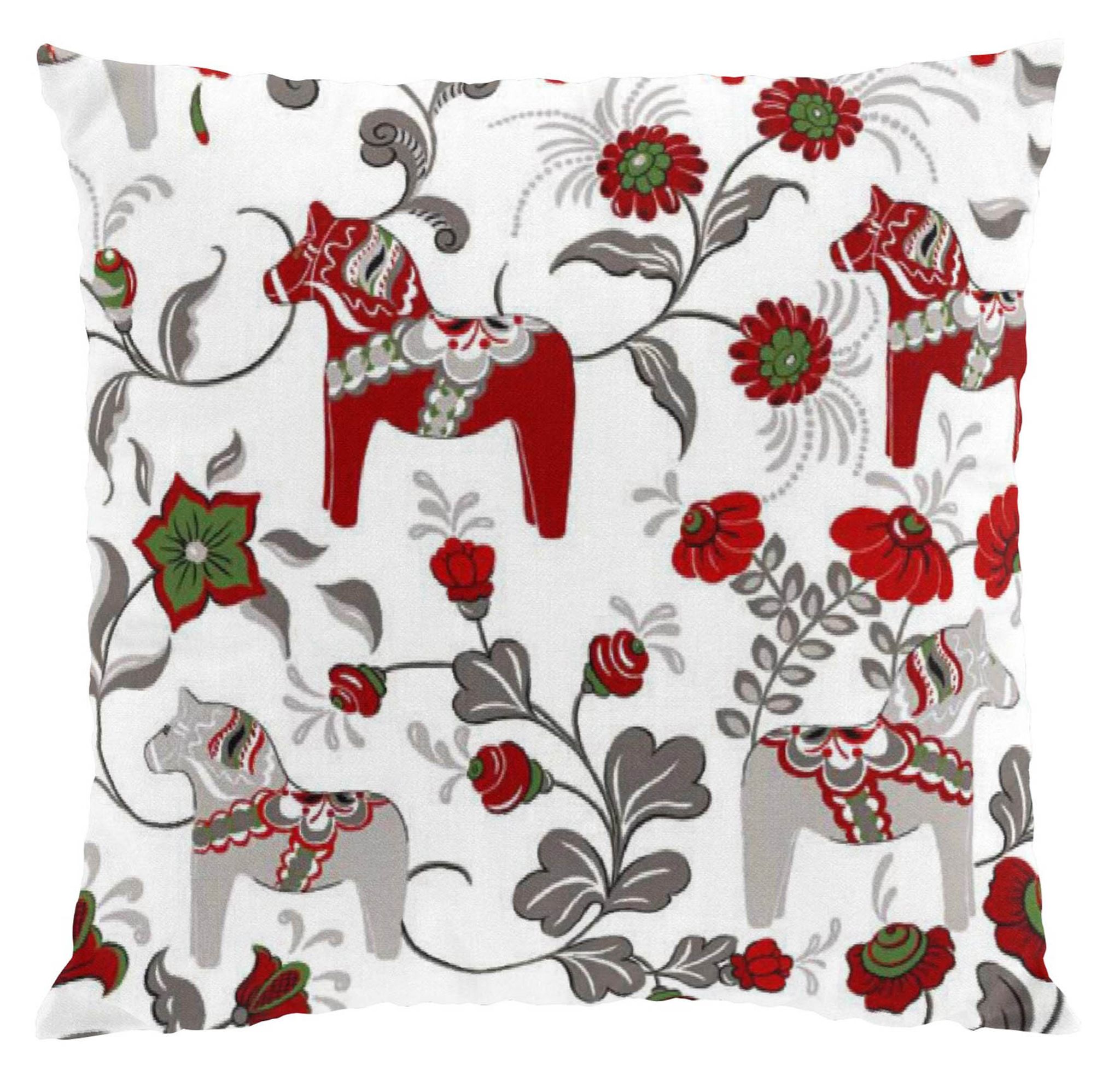 Leksand offwhite/röd kuddfodral från Arvidssons Textil förgyller soffan med det ikoniska Leksand-mönstret och Dalahästarna. Tyget "Leksand med Dalahästar" fångar den traditionella och folkloristiska andan från Dalarna med lekfulla hästar i olika nyanser som dansar över en ljus grund. I år firar mönstret 30-års jubileum med en särskild jubileumsfärg – perfekt som färgaccent i vardagsrum, sovrum eller hall.
