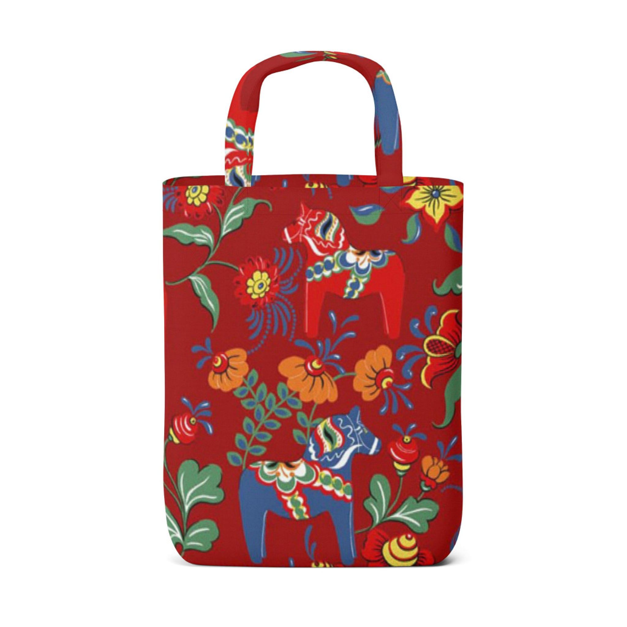 Leksand röd kasse från Arvidssons Textil fångar den svenska dalatraditionen i en livfull tygkasse med Dalahästar. Det färgglada mönstret Leksand Mini, inspirerat av den välkända dalahästen och kurbitsmålningar, skapar en lekfull och rustik känsla som passar både vardag och fest.