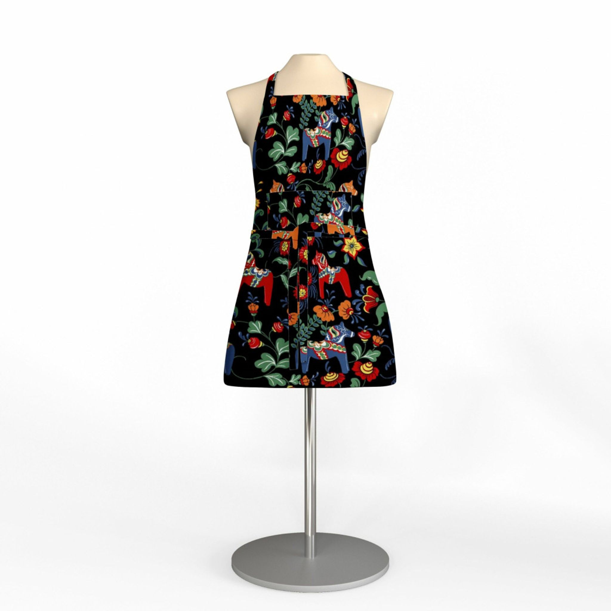 Upptäck Leksand svart förkläde med ficka från Arvidssons Textil – ett stilrent och praktiskt förkläde som fångar den färgsprakande dalahäst-traditionen.