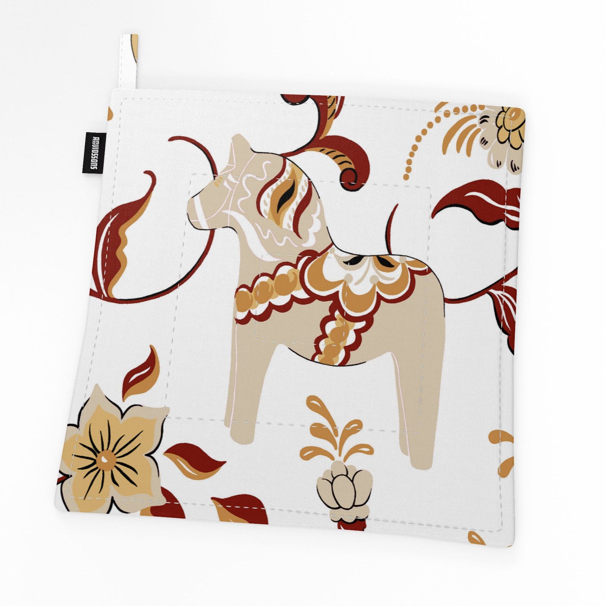 Leksand vinröd grytlapp från Arvidssons Textil är en stilren och funktionell köksdetalj som för med sig svensk tradition. Grytlappen bär tyget ”Leksand med Dalahästar”, en färgstark och charmig textil som fångar Dalarna med ikoniska Dalahästar och kurbitsmålningar.