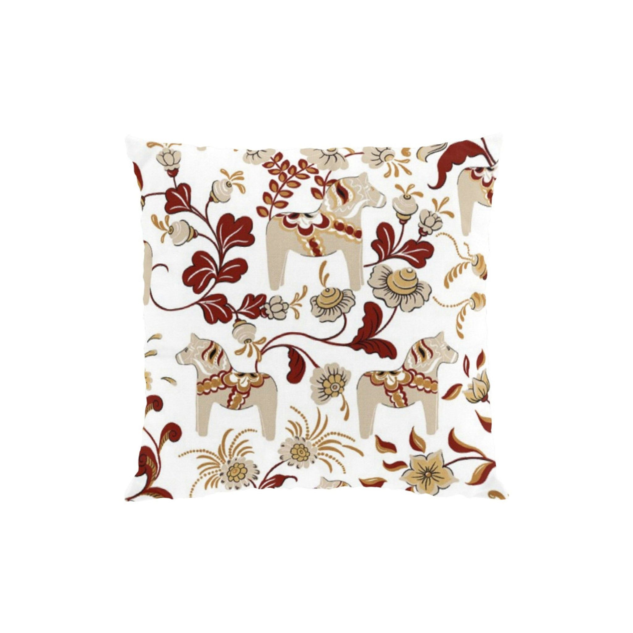 Leksand vinröd kuddfodral från Arvidssons Textil lyfter inredningen med en färgstark hyllning till Dalarnas kultur. Mönstret Leksand Mini förenar ikoniska Dalahästar med kurbitsmålningar och firar traditionsenligt en jubileumsfärg i år.