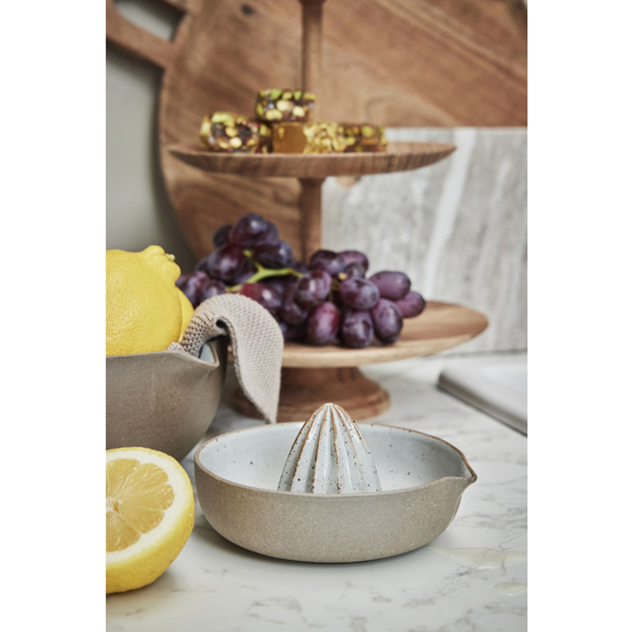 - Material: Tillverkad i stengods med en elegant matt yta och en glaserad, lätt prickig insida för en hantverksmässig och rustik look.