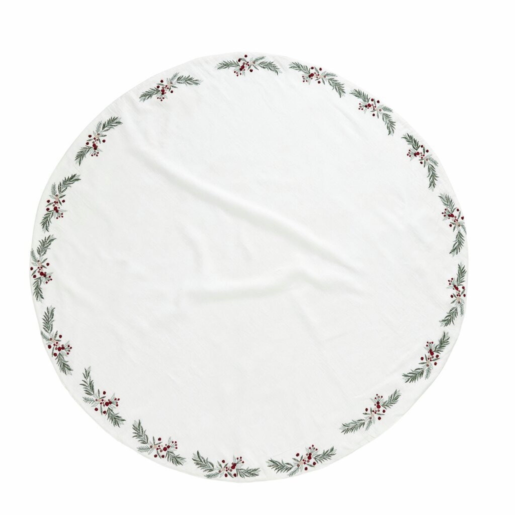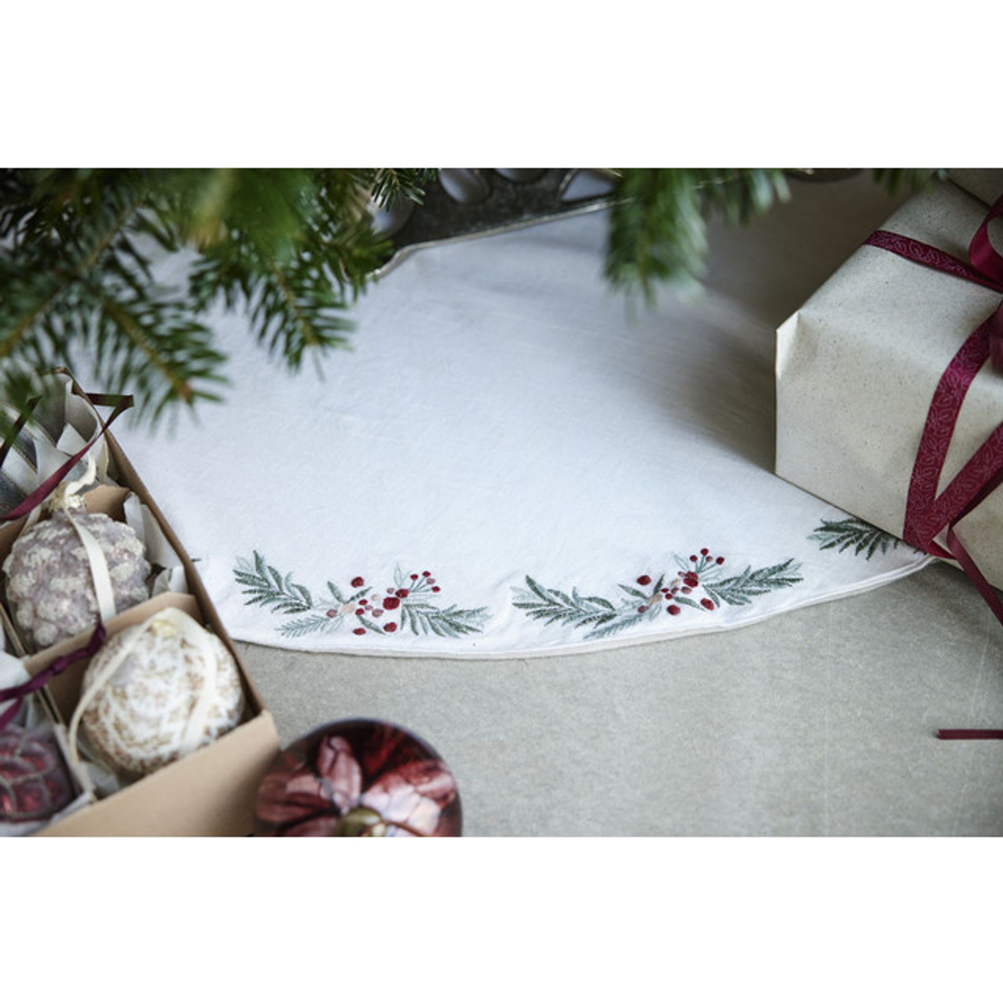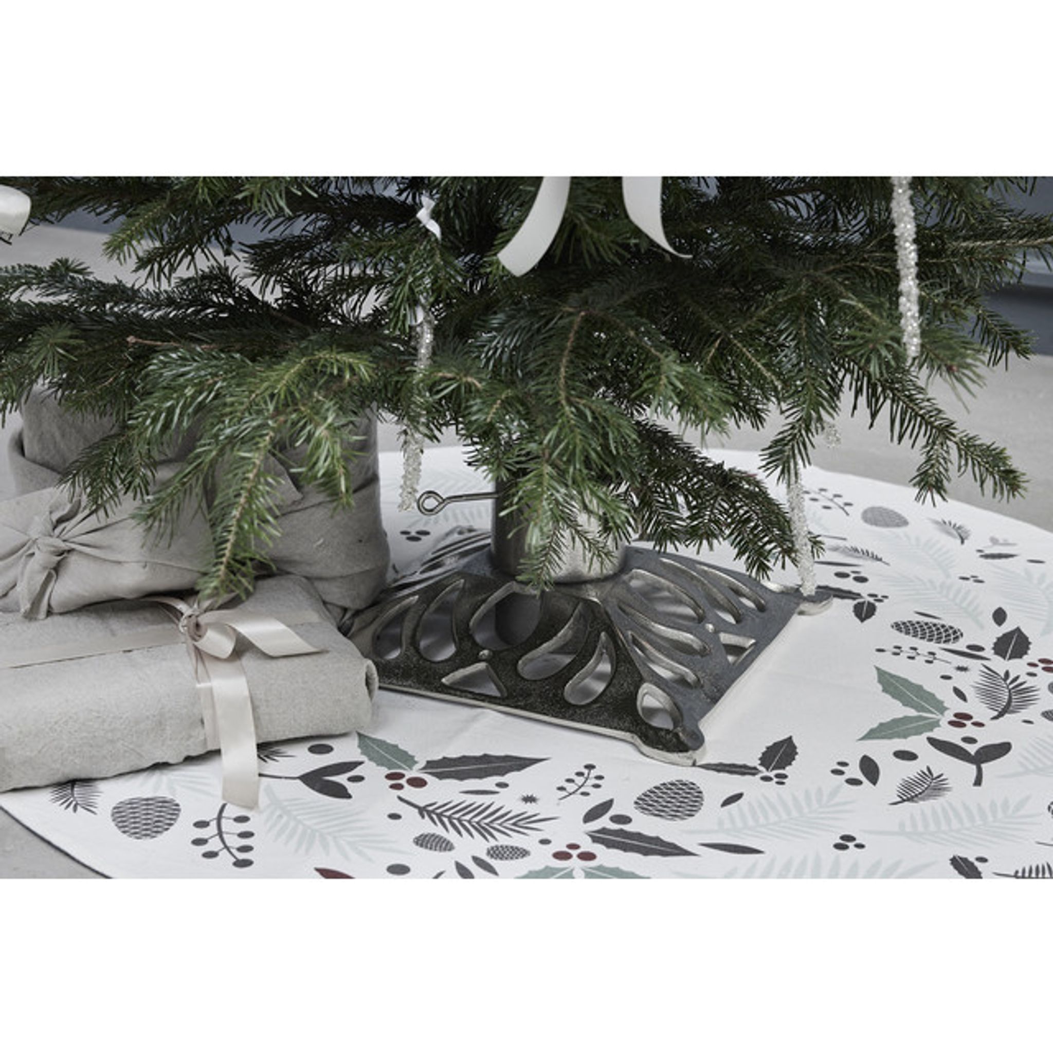 Skapa julstämning med Lene Bjerre Penine Julgransmatta, Ø110 cm. Mjuk matta med broderade detaljer av hollyblad och festliga motiv.