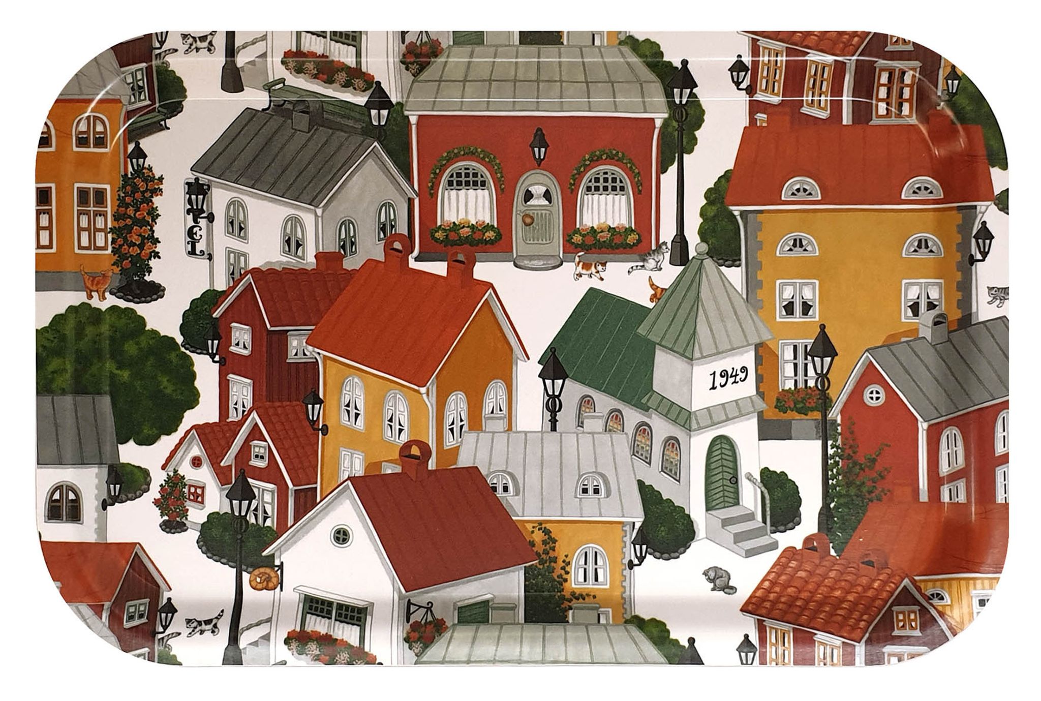 Upptäck den vackra Lyckeby Blommar brickan från Arvidssons Textil, designad av MiaLotta Arvidsson-Mars. Denna unika bricka är handmålad och fångar essensen av svensk sommar med sitt färgglada mönster av pittoreska hus.