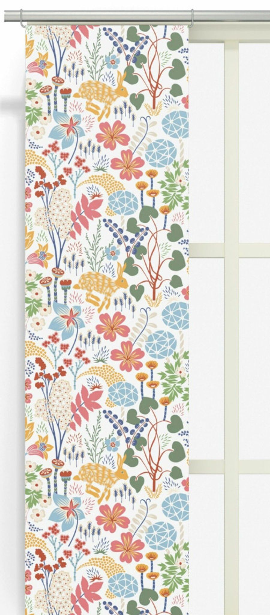 Fördelar: mjuk bomull med ett lekfullt, färgstarkt motiv som livar upp rummet. Passar som gardin eller avskärmning och går bra att kombinera med olika inredningsstilar tack vare det mångfacetterade färgschemat.