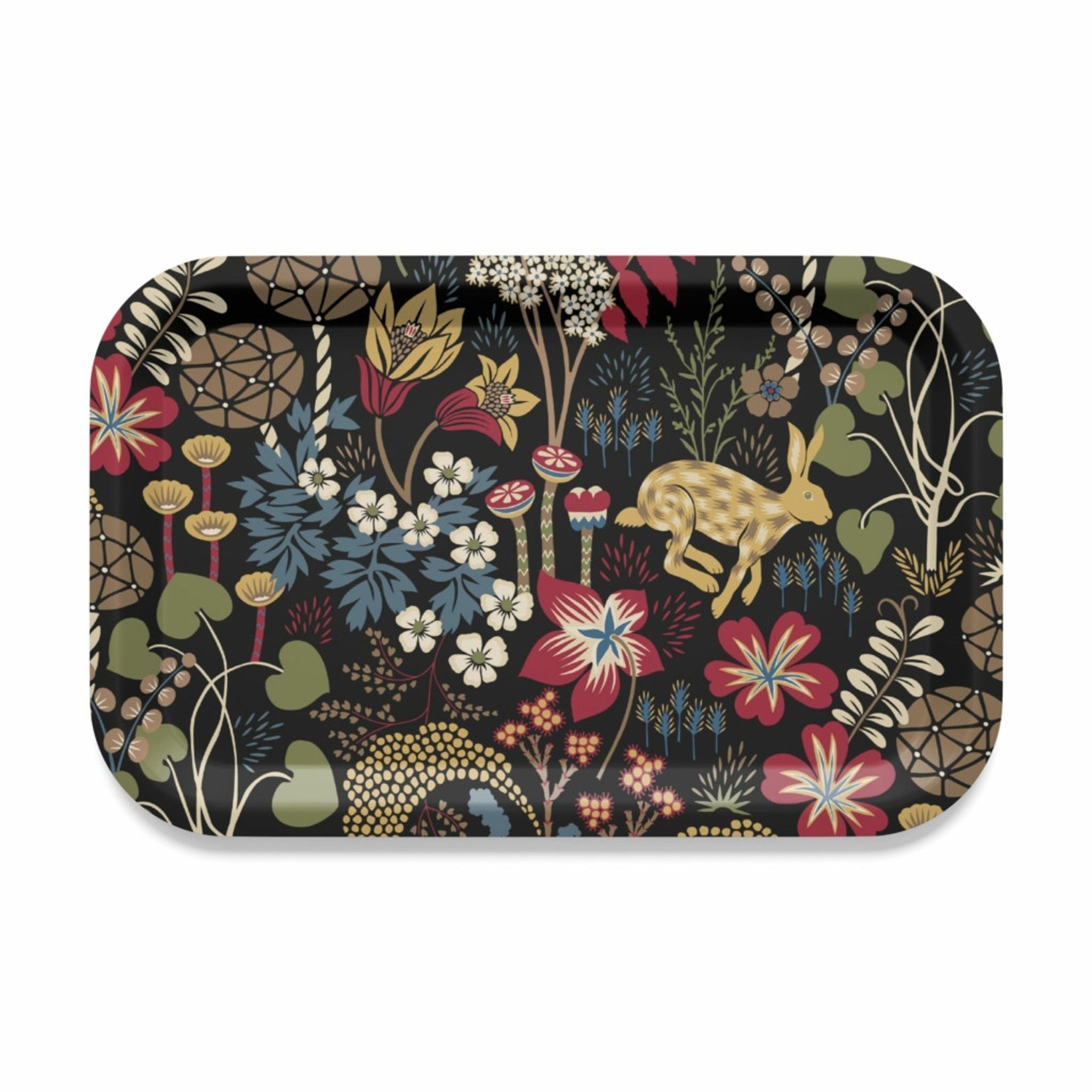 Lyckeflykt röd/brun bricka från Arvidssons Textil i björkfanér. Mönstret i röd och brun nyans mot en mörk bakgrund ger ett varmt, naturinspirerat uttryck i kök, vardagsrum eller hall. Designad av Hanna Werning.