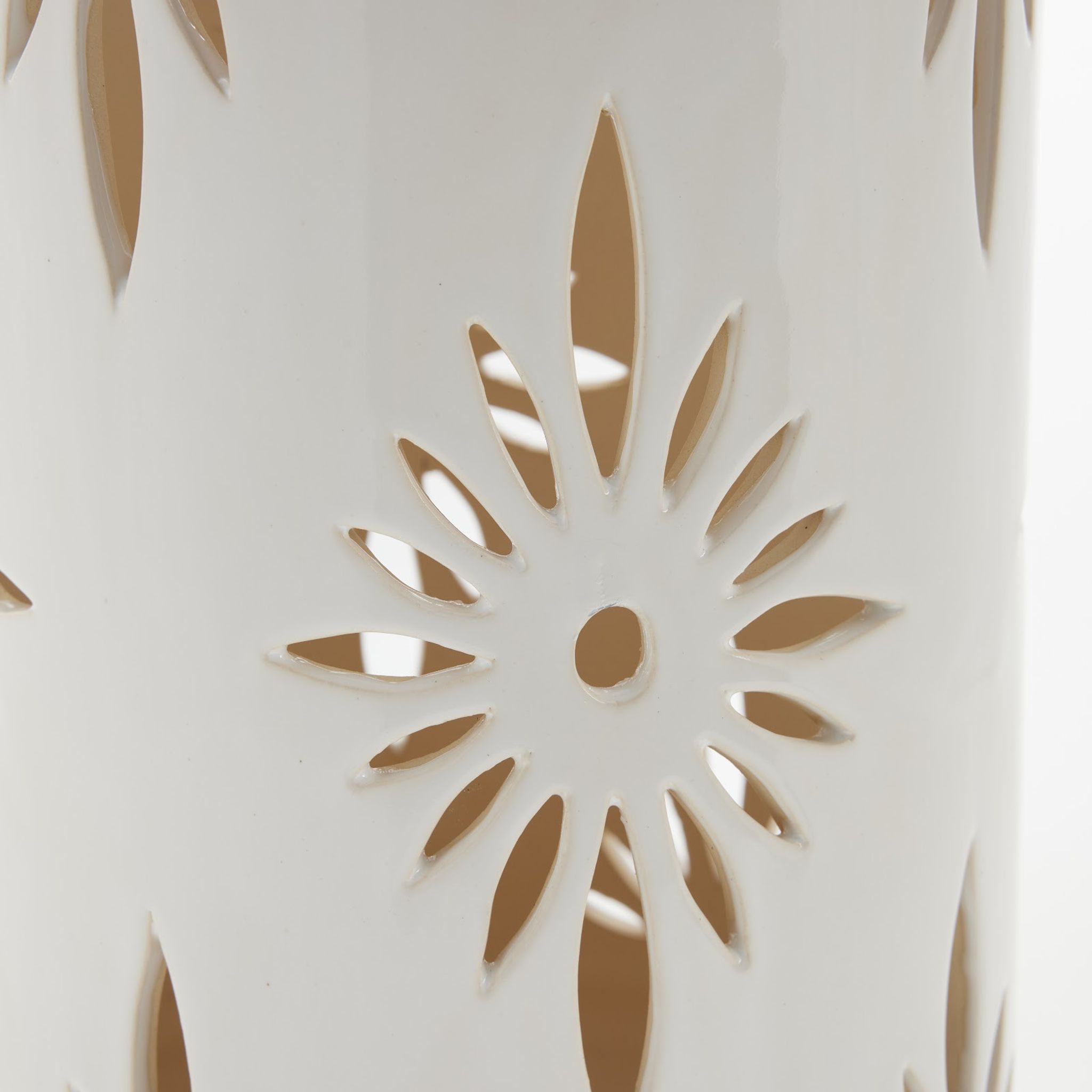 Den här keramiska lyktan kombinerar funktion och form: de inristade mönstren ger fina ljusmönster som rundar av rummet och skapar en varm stämning. Använd den som bordslampa för värmeljus eller som fristående dekor på uteplatsen — den gör vardagsrummet och trädgården mer inbjudande.