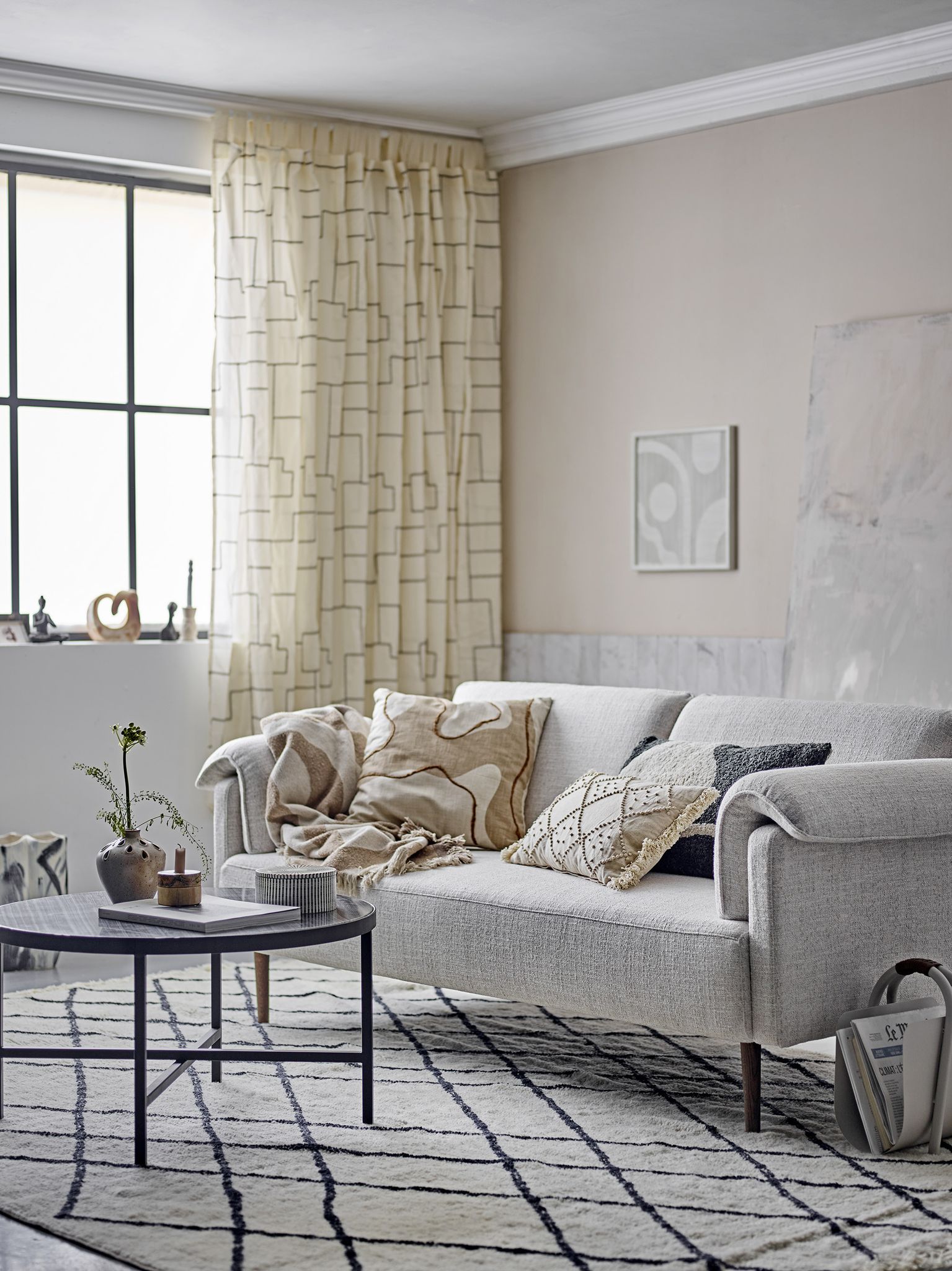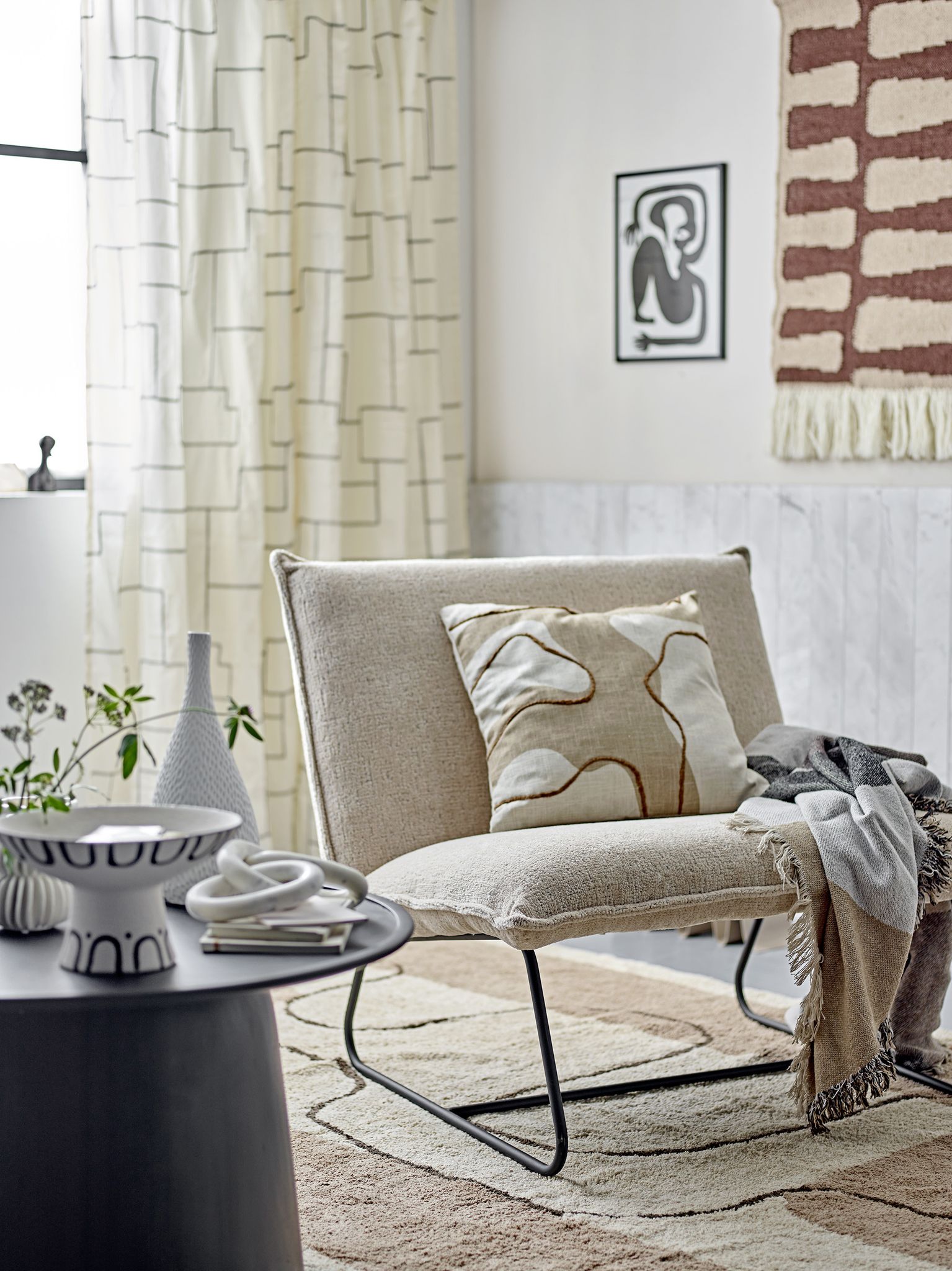 Denna Lyria-gardin från Bloomingville är designad för moderna hem där funktion och form spelar roll. Bomullstextilen ger ljusfiltrering samtidigt som den ger privatliv, så du får både dagsljus och avskildhet. Mönstret gör att gardinen fungerar som en enkel detalj i din heminredning utan att ta över.