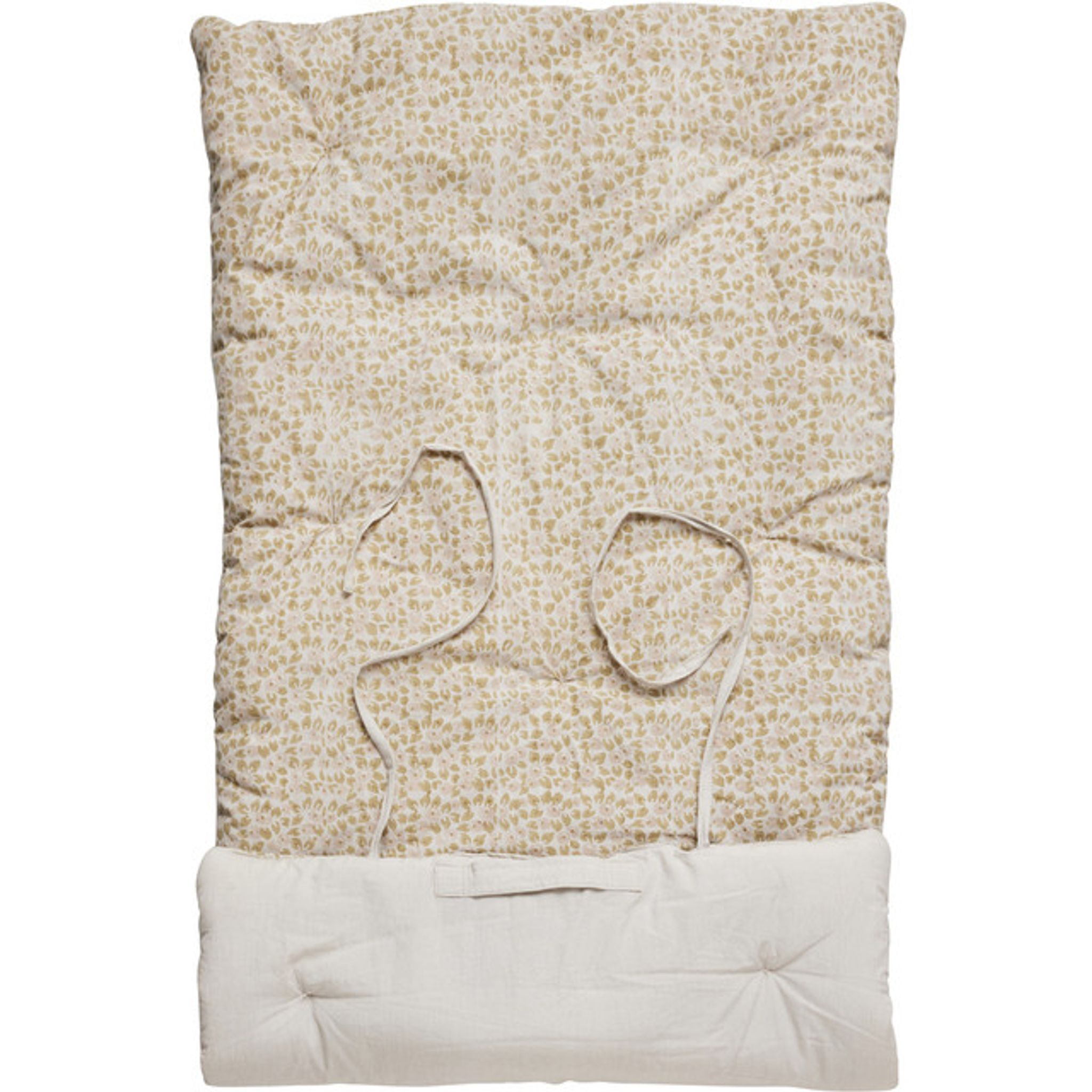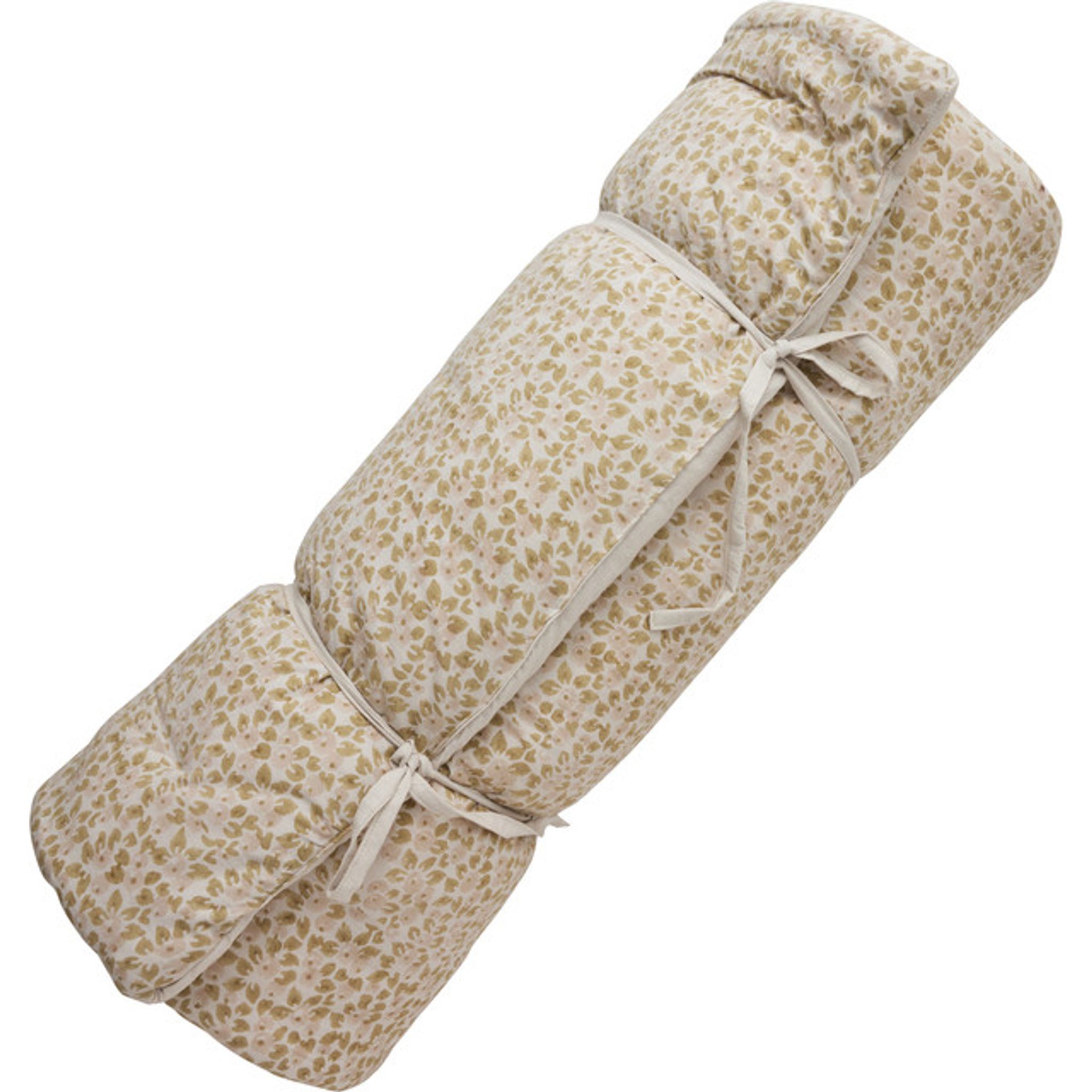 Madrassen är lätt att rulla ihop och strama åt med de medföljande remmarna, vilket gör den enkel att flytta och förvara. Den ger en mjuk och luftig sitt- eller viloyta som fungerar som golvmadrass, extra säng eller som en del av dina sängtextilier. Det handtryckta motivet ger varje exemplar ett eget uttryck utan att påverka funktionaliteten.