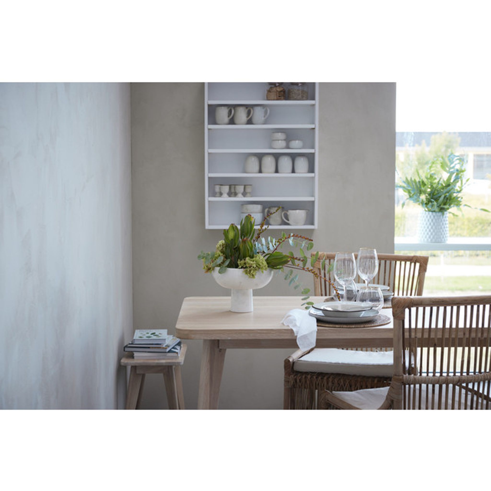 Ellie Matbord Vitkalkad Ek är ett gediget matbord i skandinavisk design som passar i din matplats och blir en naturlig samlingspunkt vid middagar. Med sin ljusa, vitkalkade yta lyfter det rummet utan att ta över.
