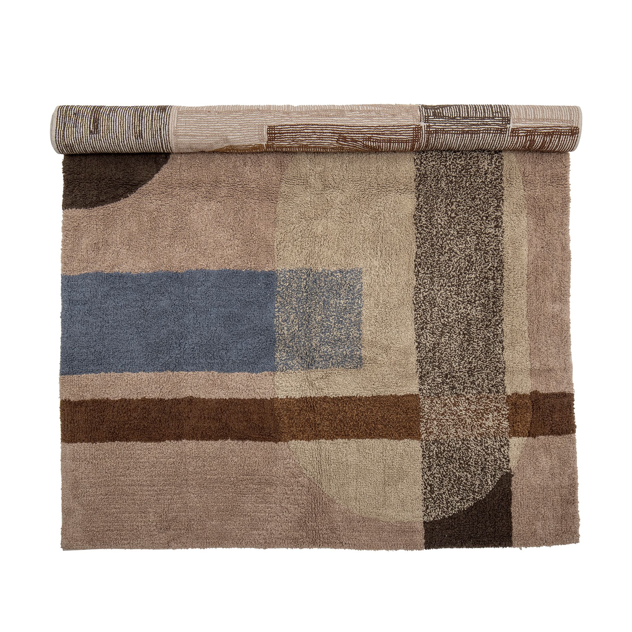 Zofia Brun bomullsmatta från Bloomingville är en matta i nordisk stil som passar i vardagsrum och sovrum. Den grafiska tuftade ytan i blå och jordnära toner ger värme och en tydlig mittpunkt i rummet, samtidigt som den känns ombonad under fötterna.