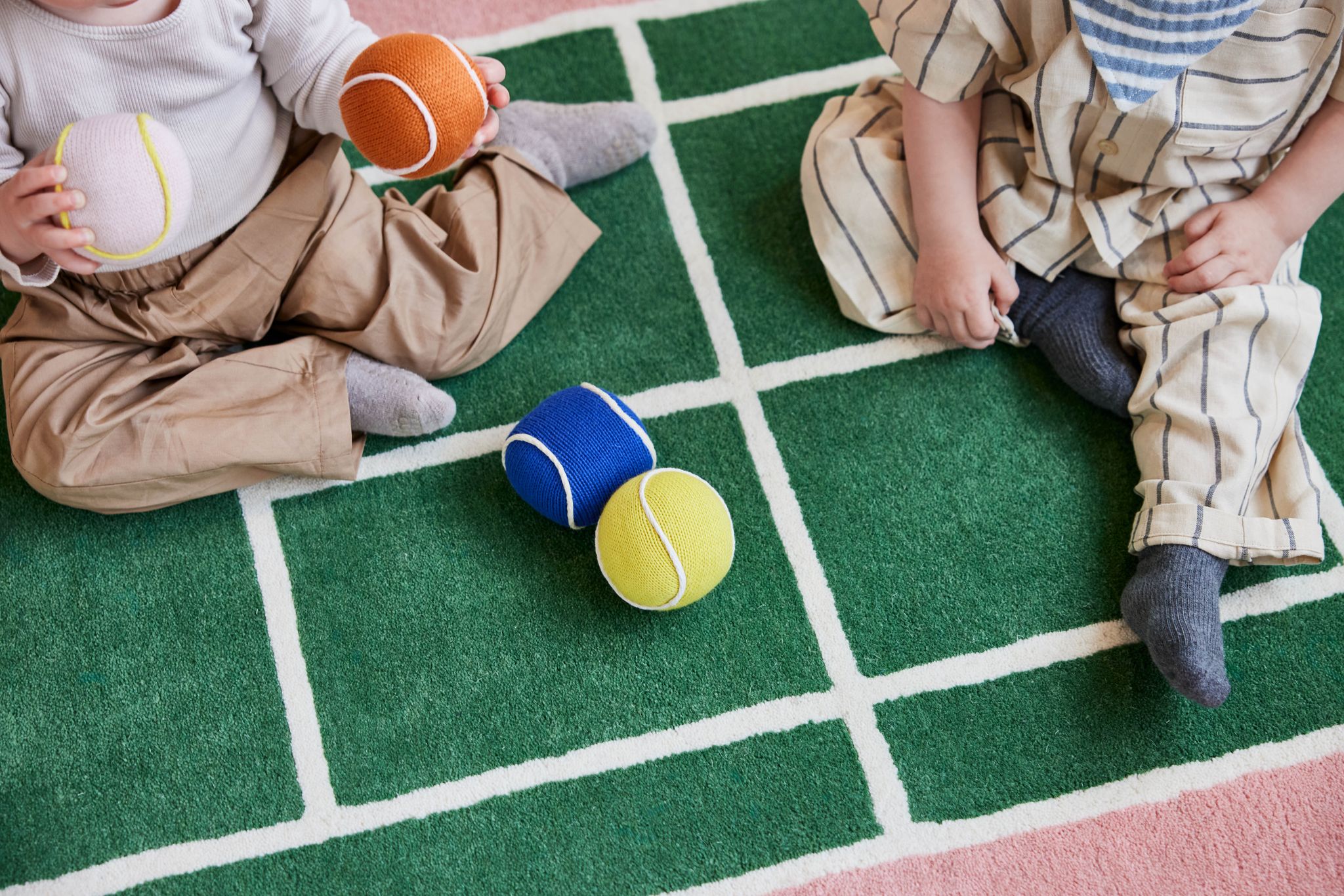Kids Tennis Rug kombinerar funktion och form. Den mjuka ytan skyddar små fötter under lek eller sagostund och skapar en ombonad hörna för aktiviteter. Som barnmatta ger den både komfort och en plats där leken får ta plats.