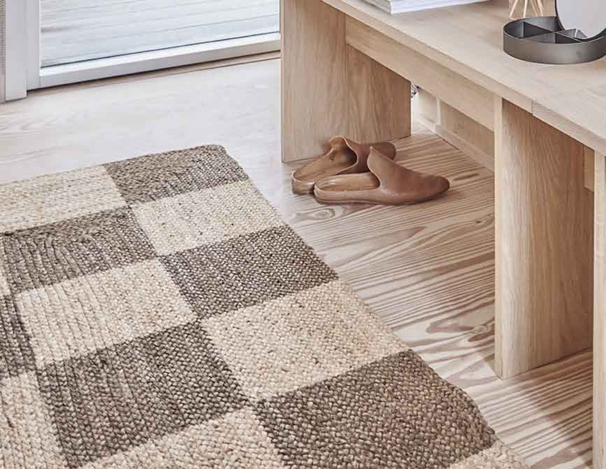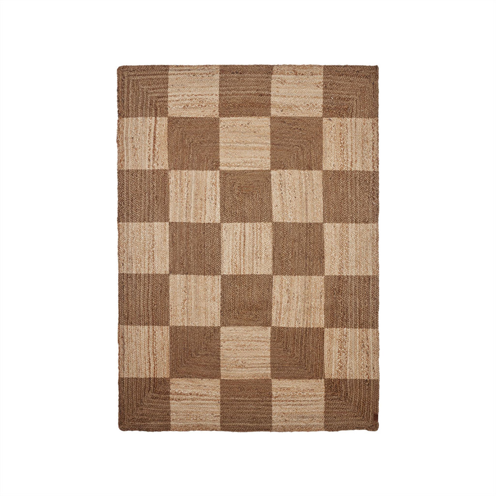 Schackmatta i jute 140 x 200 cm från Oyoy Living, 0,6 cm hög. Din matta passar i vardagsrum eller under matbordet, funkar bra, håller länge, är snygg och praktisk.