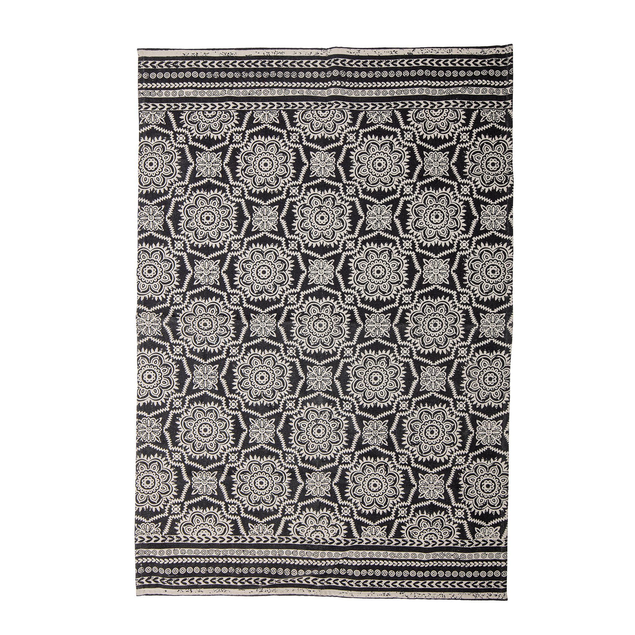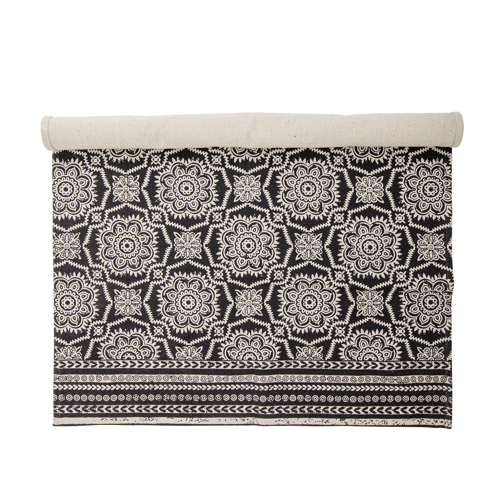 Aco matta i svart bomull, 120x180 cm från Bloomingville. Den är snygg och praktisk, håller länge och passar i ditt vardagsrum eller under soffan — funkar bra för vardagsbruk.