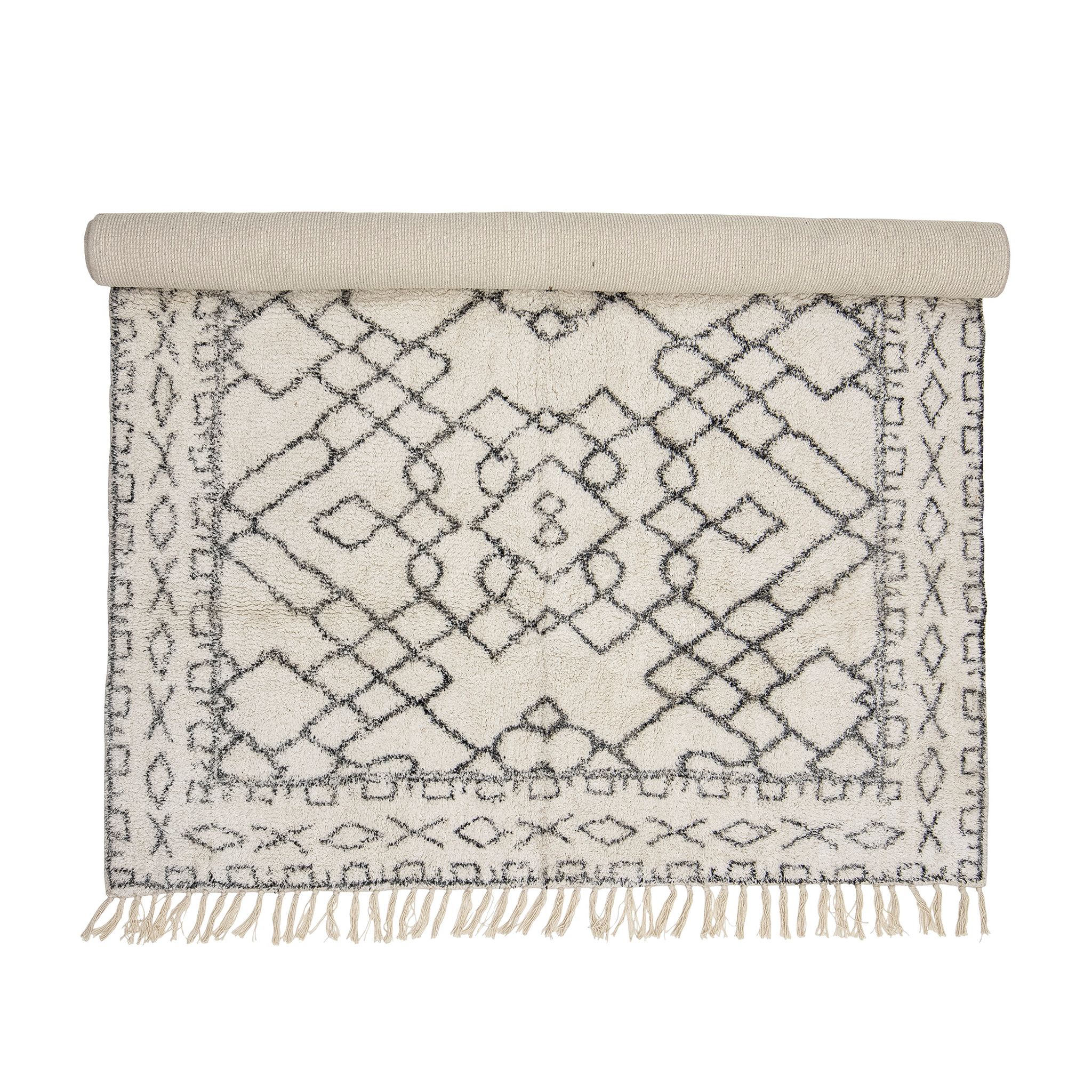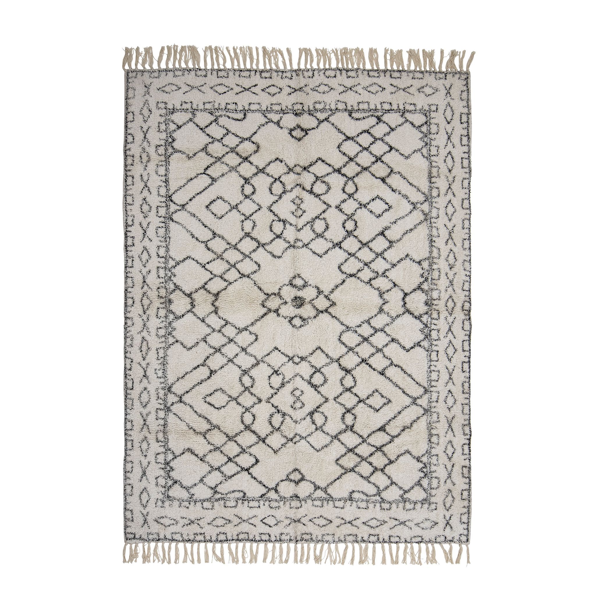 Jaqueline Matta i bomull från Bloomingville med svart geometriskt mönster på vit botten är en dekorativ bomullsmatta som passar i vardagsrum, sovrum eller lekrum. Den ger värme under fötterna och skapar en inbjudande stämning i ditt hem.