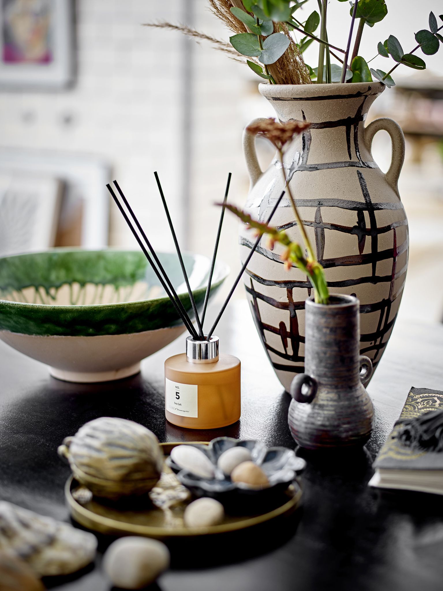 Moez-skålen från Bloomingville är en handmålad skål i grön stengods med reaktiv, krackelerad glasyr. Den passar lika bra i köket för vardagsservering som på matbordet som dekor eller som en mittenpunkt vid bjudningar — en skål som gör måltiderna lite mer personliga.