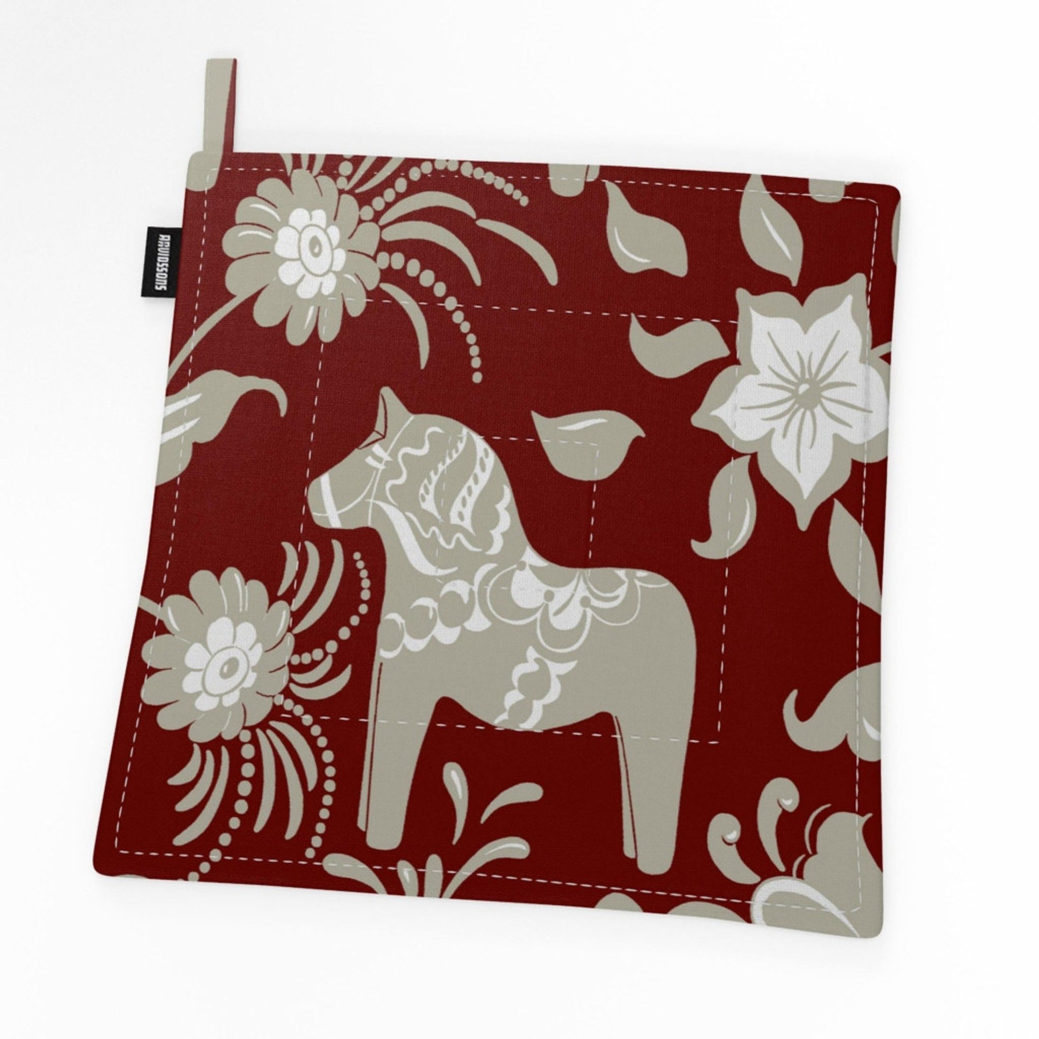 Upptäck Nusnäs röd grytlapp från Arvidssons Textil, designad av Carola Bengtsson Malmström. Tillverkad i 100% bomull som ger mjukt, skydd mot hetta när du hanterar kastruller och ugnsvarma föremål. Det klassiska Nusnäs/Dalahäst-mönstret i rött och beige ger köket en svensk, tidlös känsla och passar både vardag och fest.