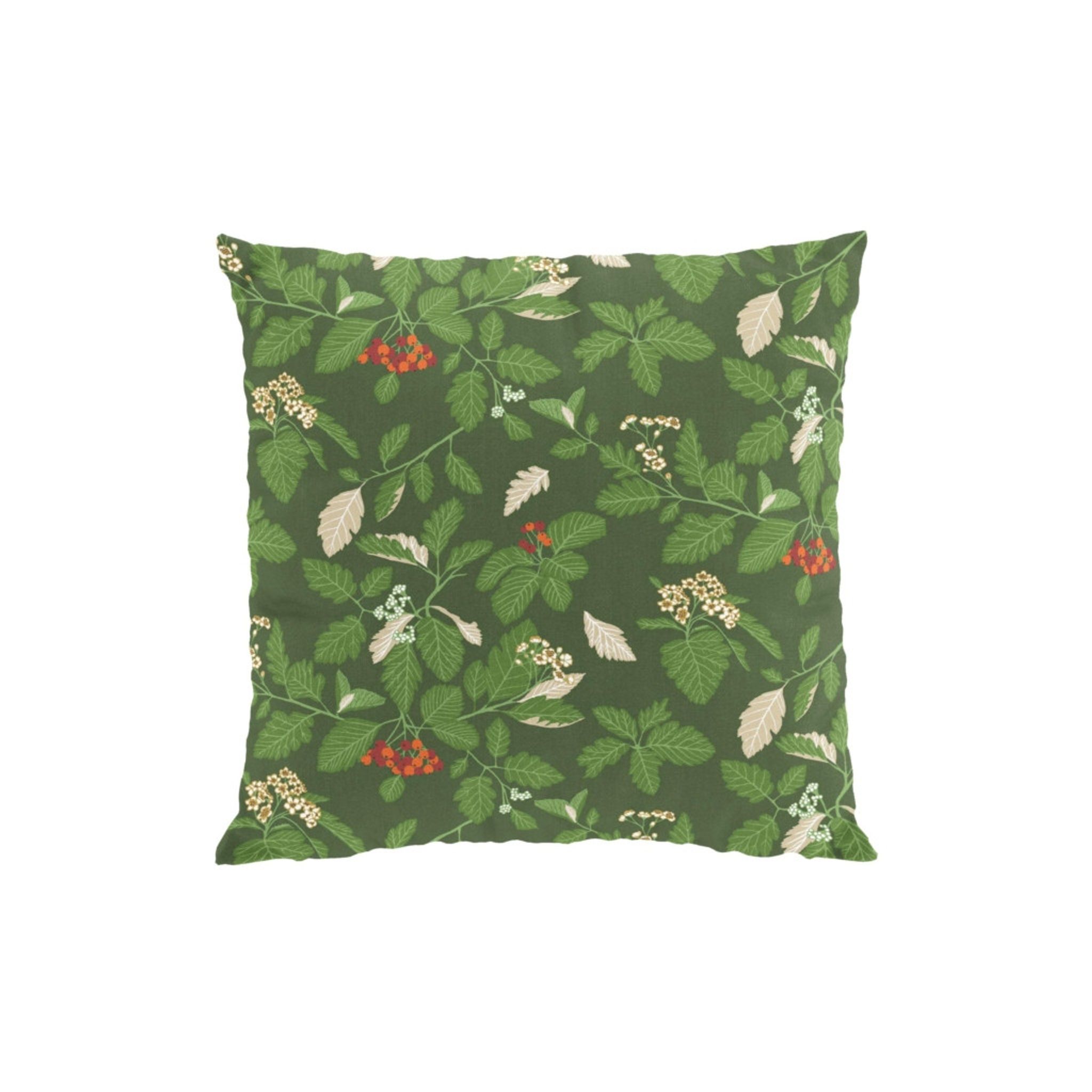 Oxel grön kuddfodral från Arvidssons Textil i bomull med ett växtbaserat mönster av blad och små bär. Designat av Edholm Ullenius och perfekt för en naturinspirerad inredning.